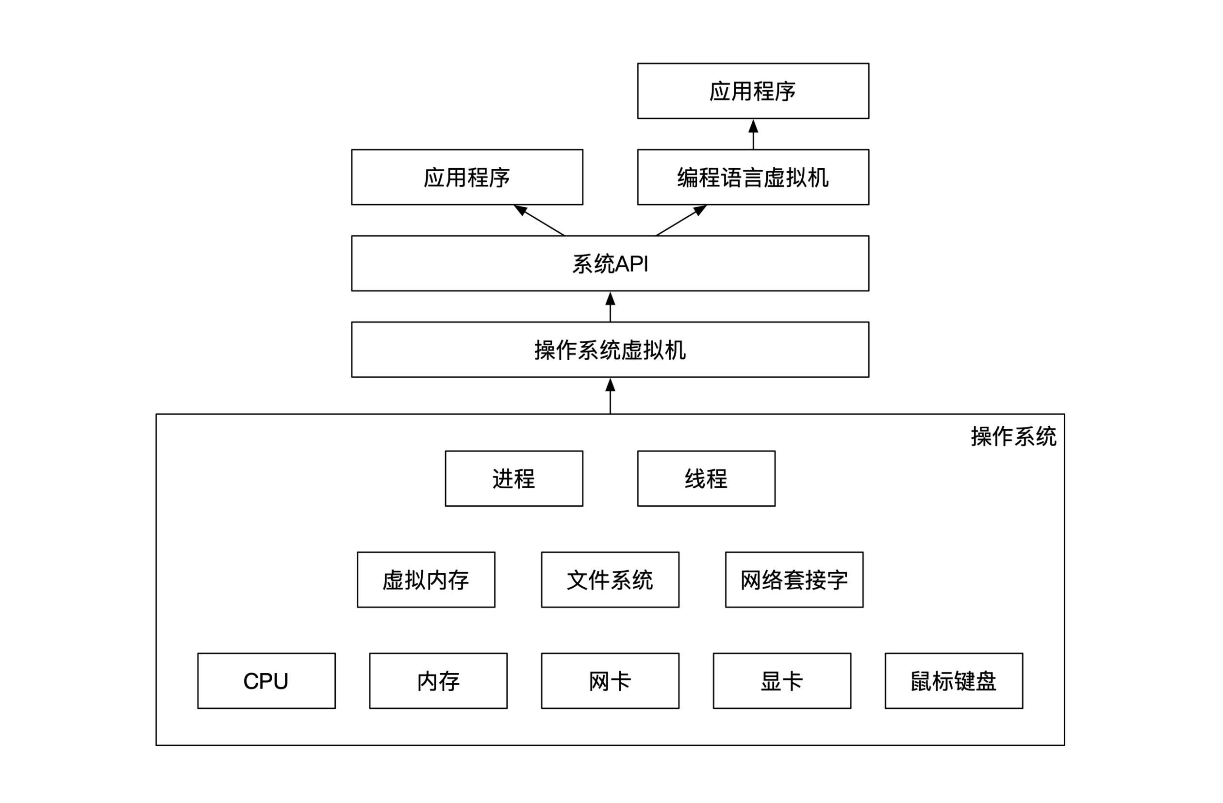 比系统API更高一级的是用户的应用程序。如果用户的编程语言选择了Java或者Python等解释型编程语言,那么还有一个中间层是这些编程语言的运行时虚拟机。