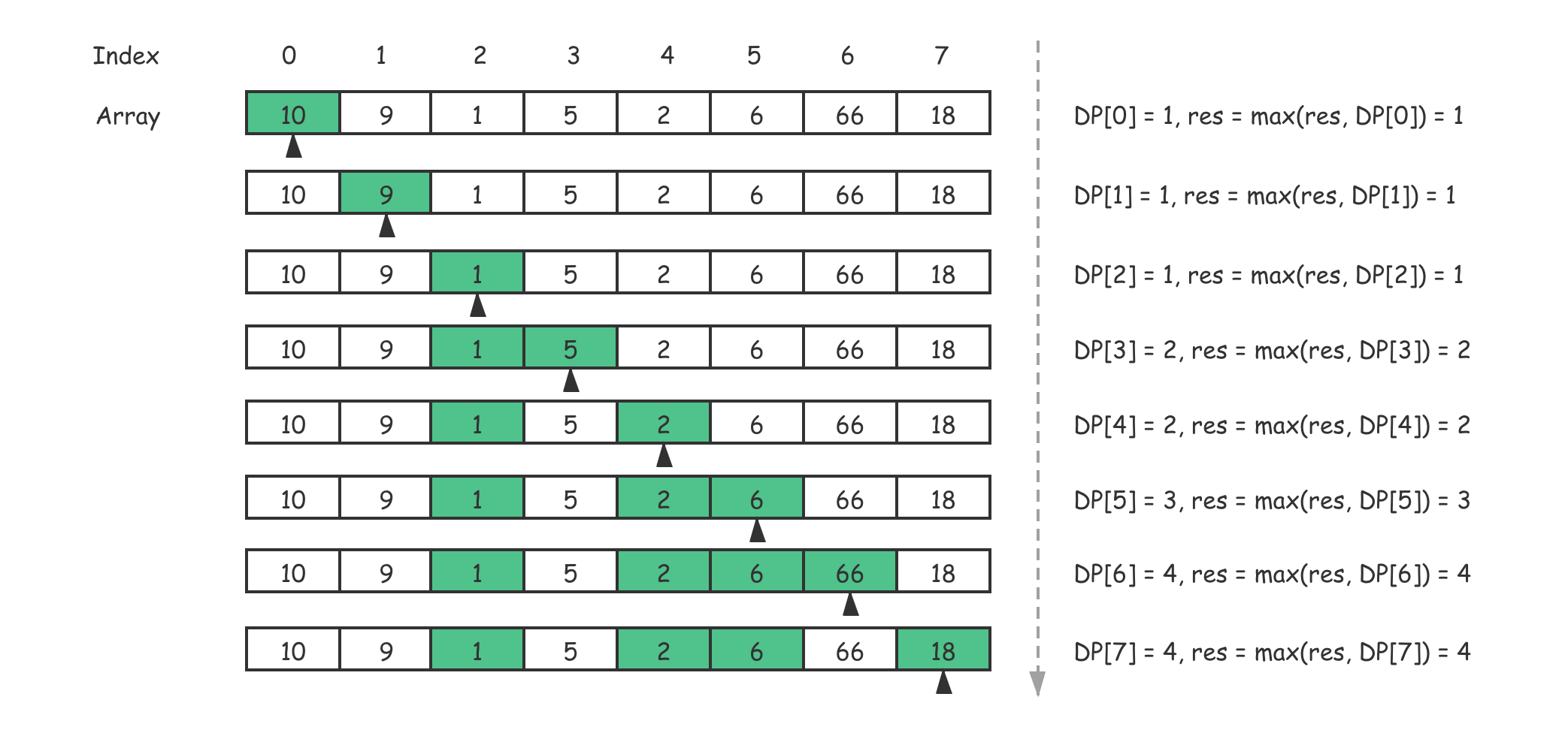 按照图示,如果我们用解决“最长连续递增序列”的思路设计一个 \(res\) 变量来求解状态转移过程,那就是 \(res = max(DP\[7\], DP\[6\])\),答案是 4。另外,我们考察一下 \(DP\[7\]\) 的解是怎么计算出来的?其实,就是从 0 … 7-1 即 0 … 6 进行一个遍历,找出比 \(nums\[7\]\) 位置小的数字,并形成上升序列,以此为基准计算出 \(DP\[7\]\) 的长度。