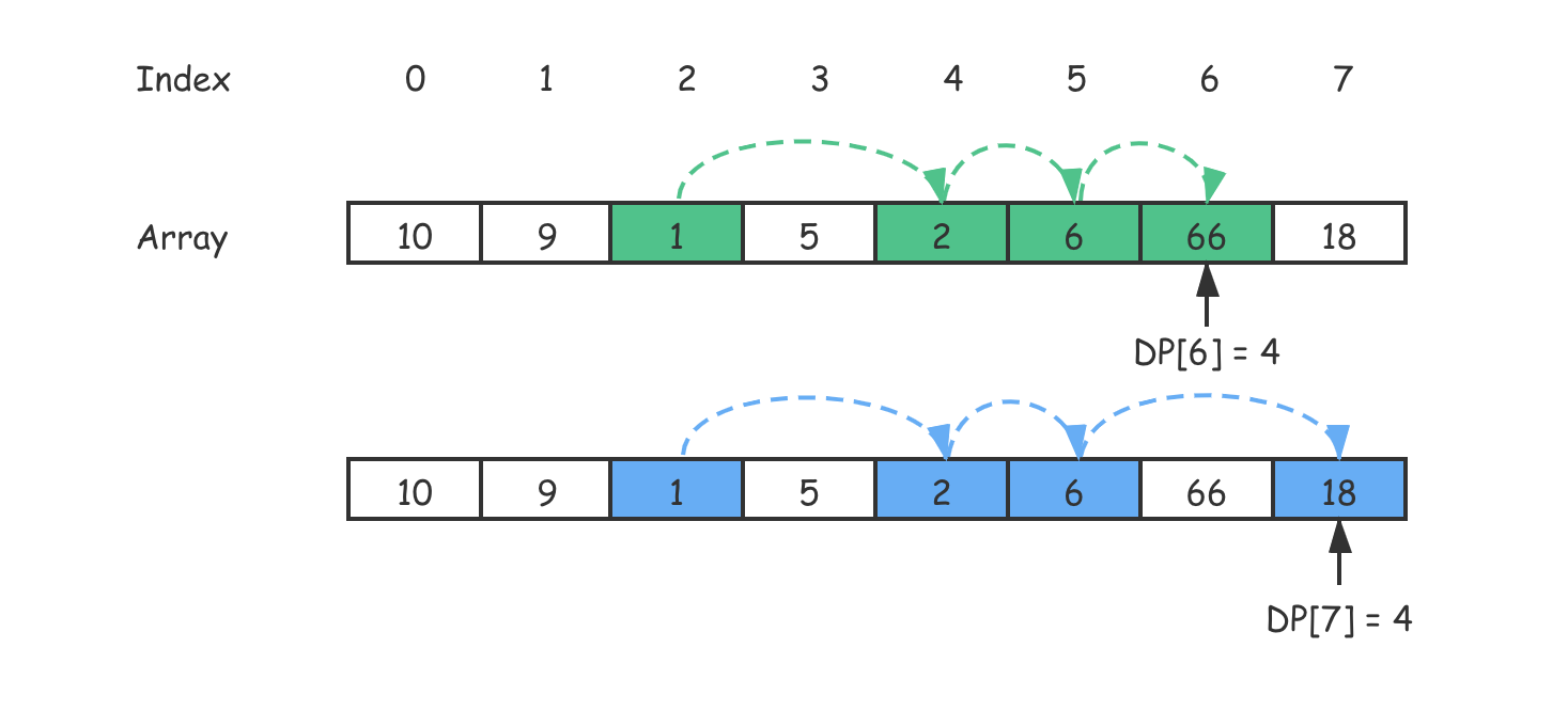 同时,需要注意的是,从 \(DP\[3\]\) 的计算开始往后,最长上升子序列的可能性就不唯一了。比如说,[1, 5, 6, 66]、[1, 5, 6, 18]、[1, 2, 6, 66] 和 [1, 2, 6, 18] 其实都是满足计算规则的。但是,原问题只需要我们求出最长上升子序列的长度,因此在上面的状态转移过程中,我没有给出其余可能性的计算过程。