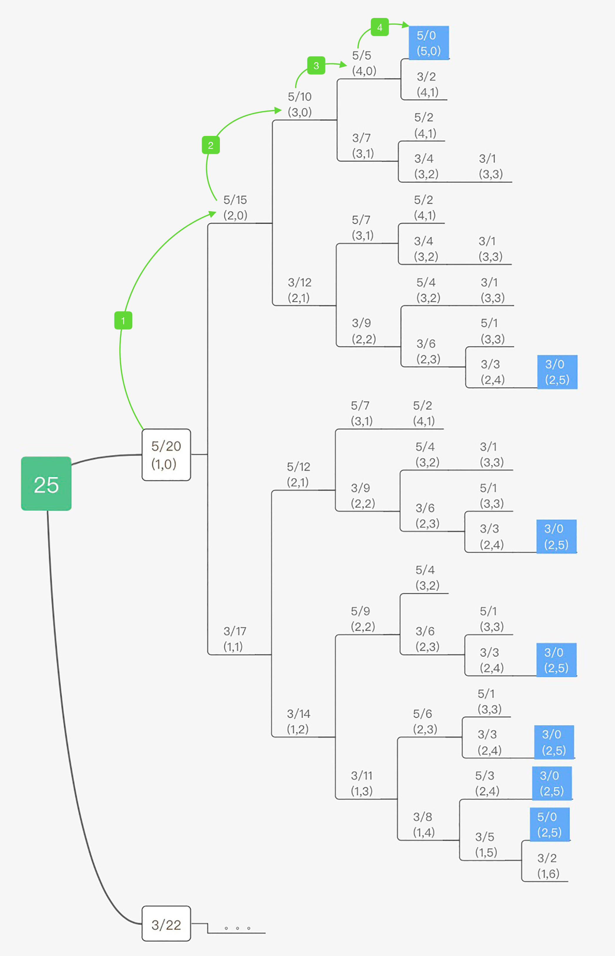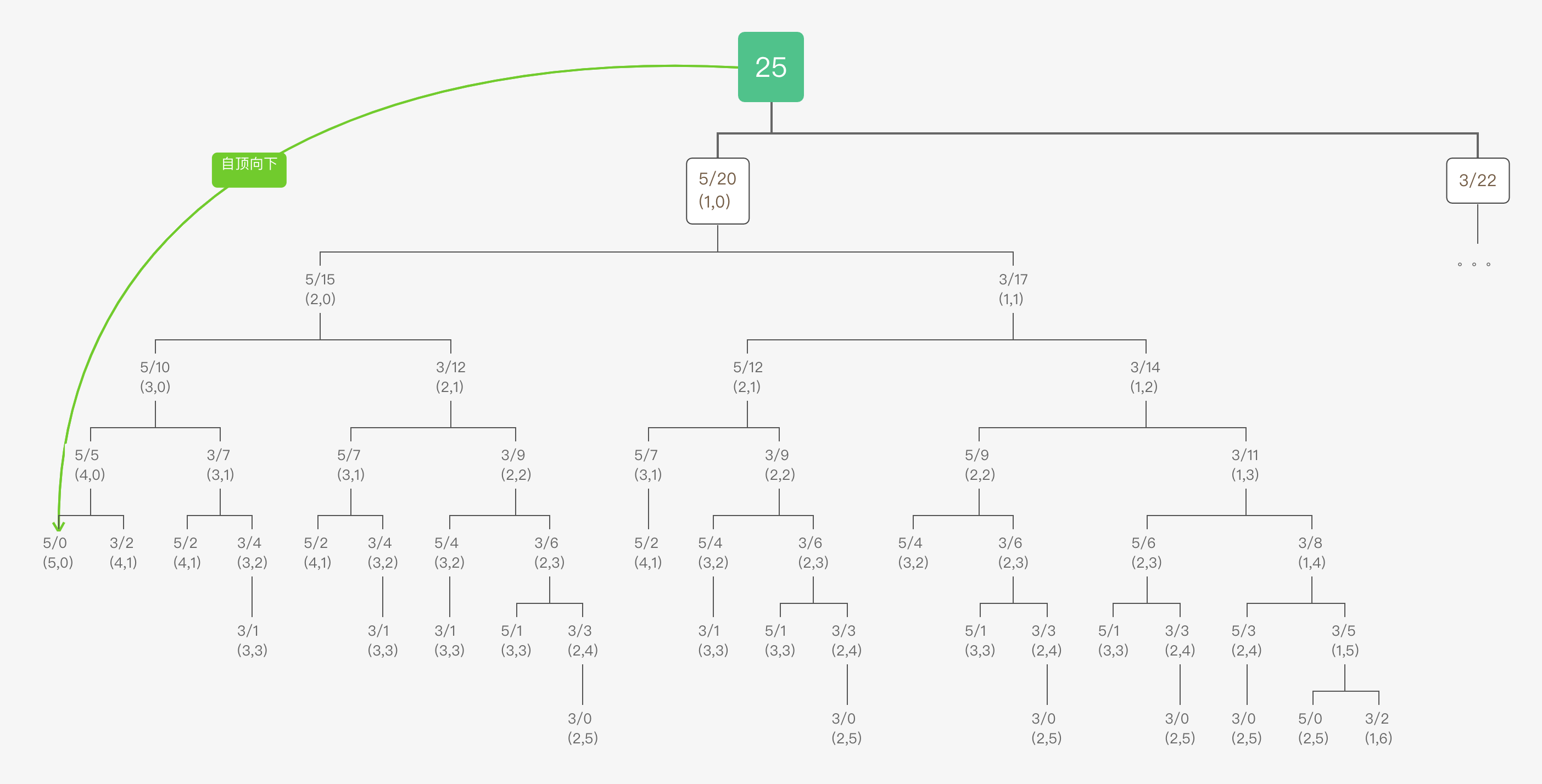 比如我们看一下 c[0]=5, c[1]=3 且 k=25 这种情况,整个求解过程我们可以画成下面这棵树。