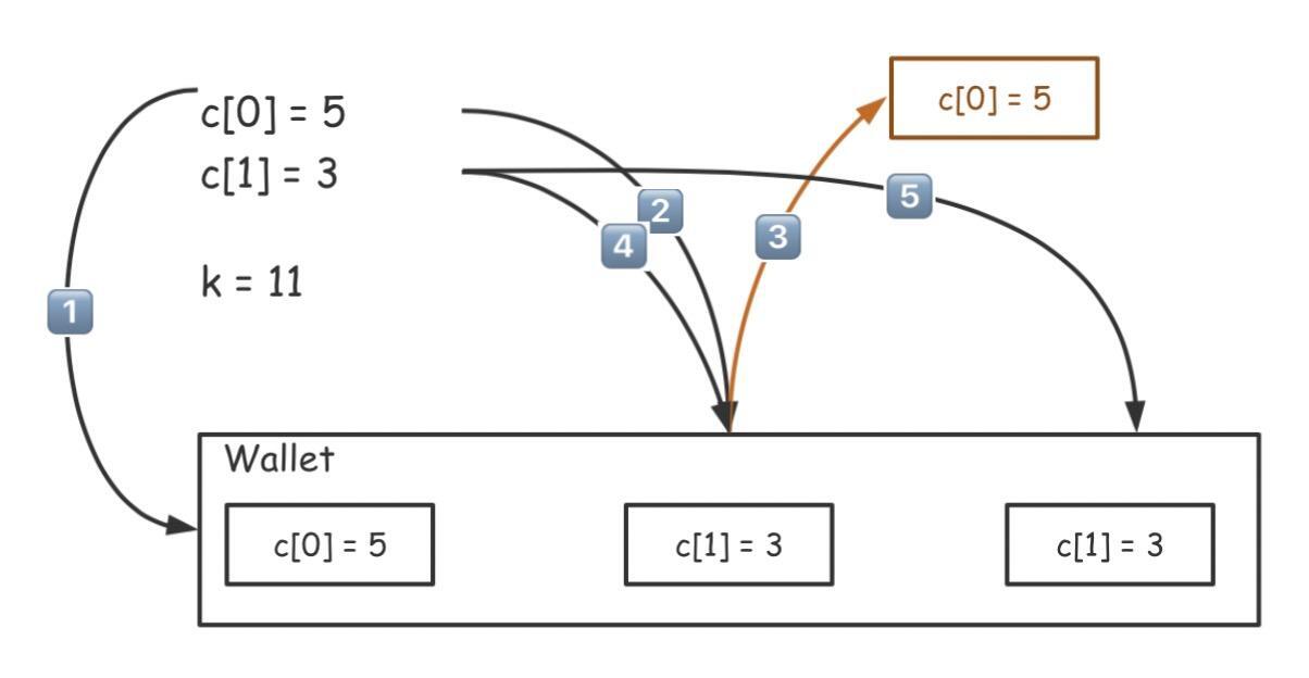 但是这种贪心是无法解决所有问题的,比如假设我们现在需要在 c[0]=5, c[1]=3 且 k=11 的情况下寻求最少硬币数。如果按照同样的原则,选择了两枚 5 元硬币后就只剩下 1 元了,如下图所示: