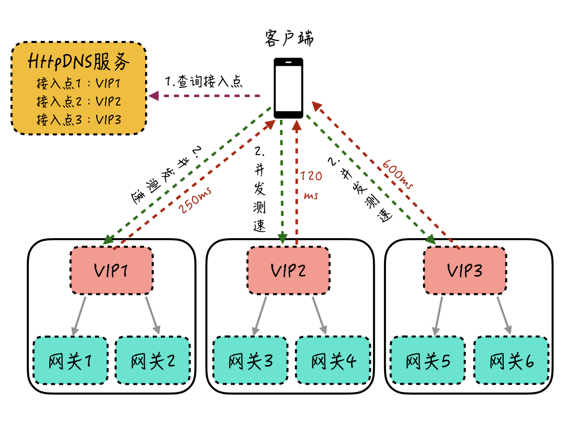 这里我举一个简单的接入点跑马竞速实现的例子:客户端在启动时,通过HttpDNS服务获取到多个接入点VIP1、VIP2和VIP3,此时客户端针对这3个VIP进行并发测速(一般可以通过访问一个固定大小的静态页面来实现),根据每个VIP的整体响应耗时来决定后续正式的连接使用哪个VIP。这里,由于VIP2响应耗时最少,最后客户端会选择使用VIP2来进行接入。这个过程你可以参考下图。