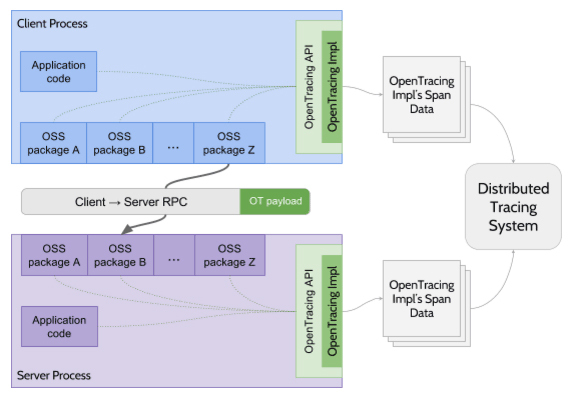 在操作层面,OpenTracing只是制定了一个很薄的标准化层,位于应用程序与追踪系统之间,这样,探针与追踪系统只要都支持OpenTracing协议,就算它们不是同一个厂商的产品,那也可以互相通讯。此外,OpenTracing还规定了微服务之间在发生调用时,应该如何传递Span信息(OpenTracing Payload)。