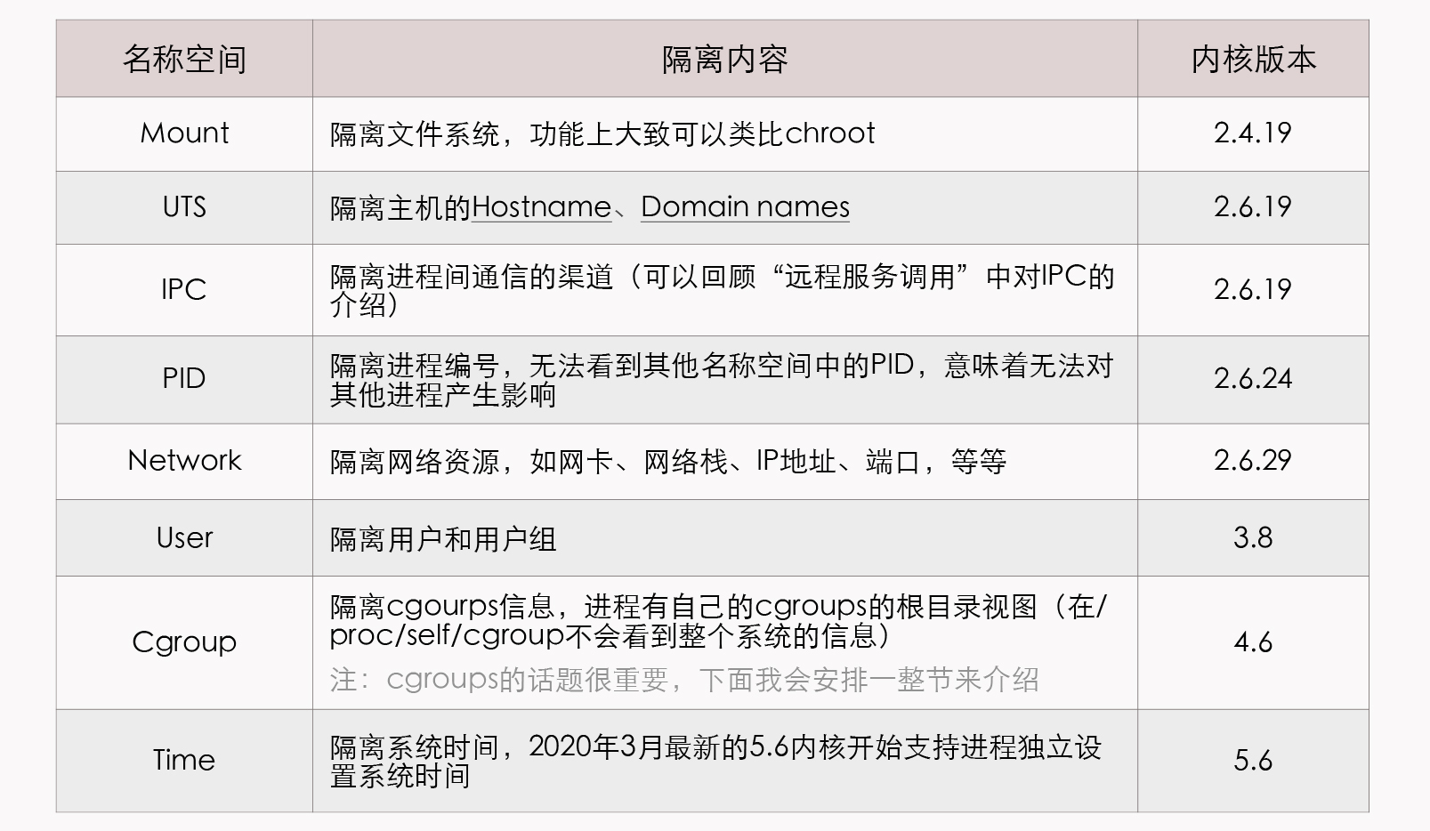 到了后来,要求系统隔离其他访问操作的呼声就愈发强烈,从2006年起,内核陆续添加了UTS、IPC等名称空间隔离,直到目前最新的Linux Kernel 5.6版内核为止,Linux名称空间支持了以下八种资源的隔离(内核的官网Kernel.org上仍然只列出了前六种,从Linux的Man命令能查到全部八种):