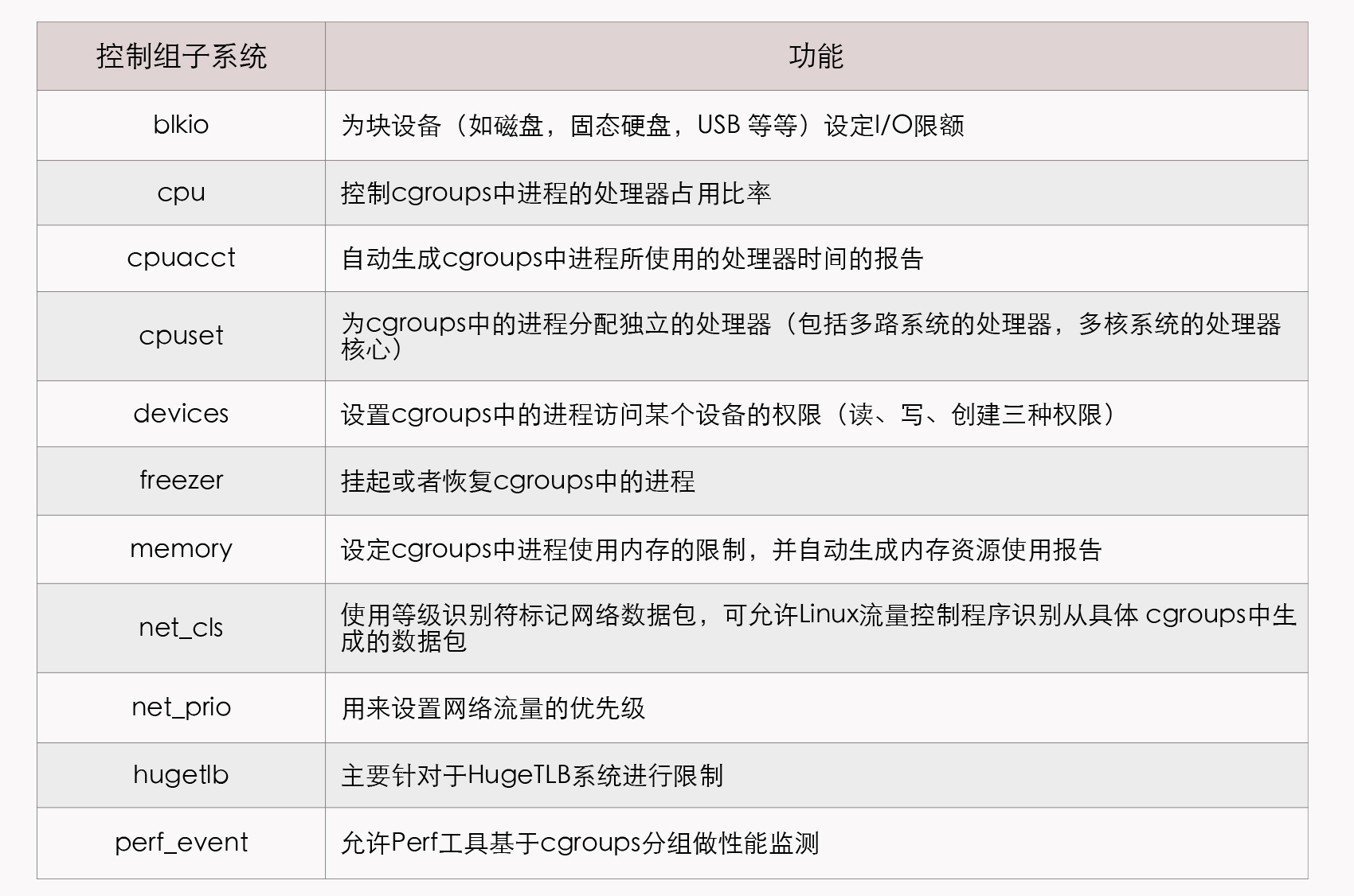 而Linux系统解决以上问题的方案就是控制群组(Control Groups,目前常用的简写为cgroups),它与名称空间一样,都是直接由内核提供的功能,用于隔离或者说分配并限制某个进程组能够使用的资源配额。这里的资源配额包括了处理器时间、内存大小、磁盘I/O速度,等等,具体你可以参考下这里给出的表格: