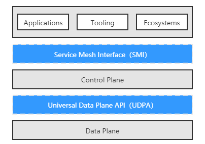 在前面的课程中,我们接触过容器运行时领域的 CRI规范、容器网络领域的 CNI规范、容器存储领域的 CSI规范,尽管服务网格诞生至今只有数年时间,但作为微服务、云原生的前沿热点,它也正在酝酿自己的标准规范,也就是这节课我们要讨论的主角:服务网格接口(Service Mesh Interface,SMI)与通用数据平面API(Universal Data Plane API,UDPA)。现在我们先来看下这两者之间的关系: