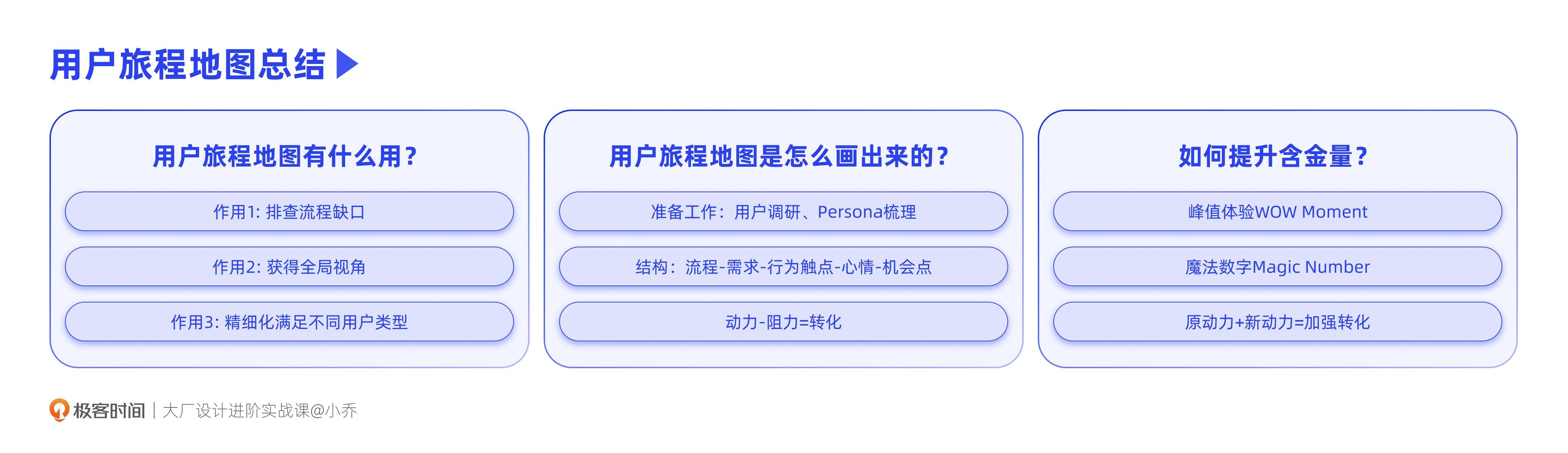 今天,我们一起学习了用户旅程地图的相关知识,了解了它的重要性、组成和步骤,以及提升机会点含金量的方法。