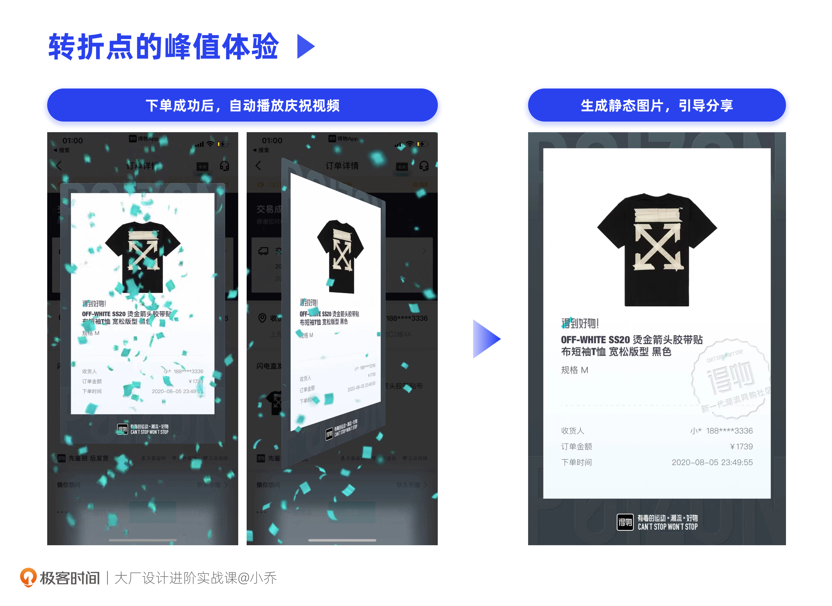 以得物为例,用户下单成功时,会跳出所购买商品的庆祝视频,并生成卡片,引起用户的分享动力,提升分享传播率。