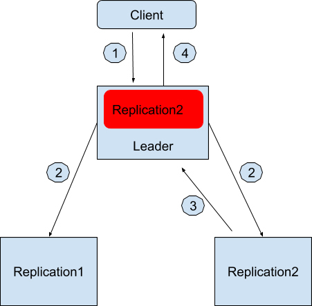 Replication1和Replication2收到消息后也保存好这条消息并且回复领导者节点写入成功。