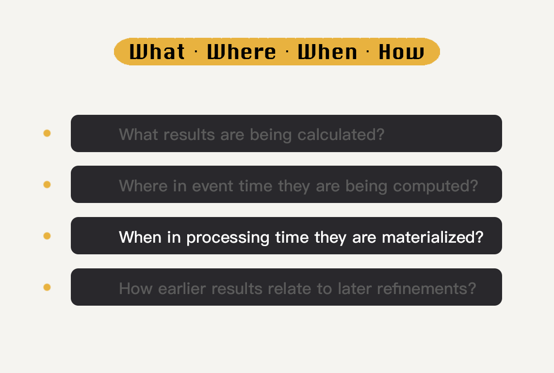 在模块四的后续的内容中,我们会围绕着这四个问题展开具体的分析,看看在Beam的实战中,这每一步是如何被解答的。