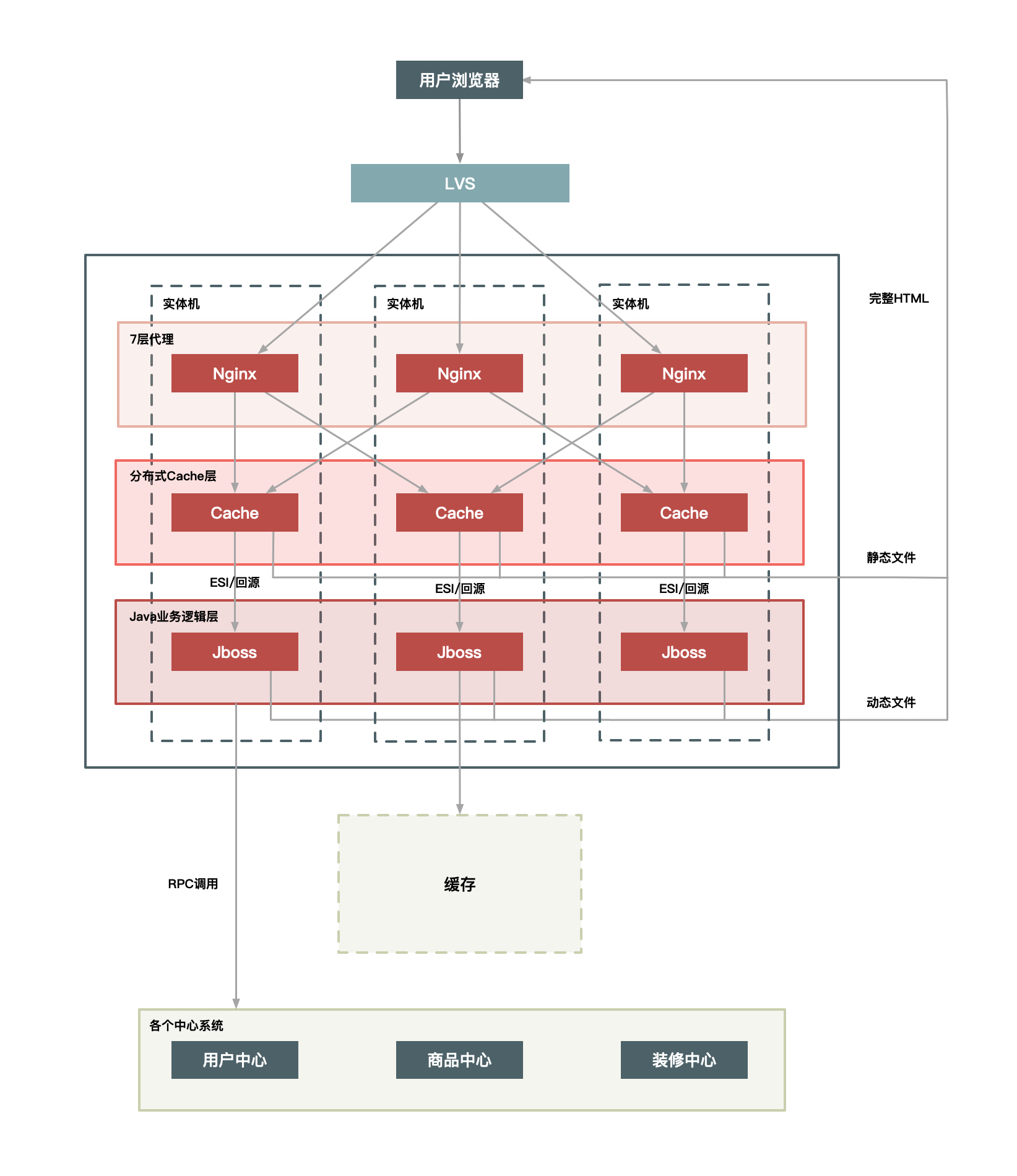 另外就是,一个实体机上部署了Java应用又作为Cache来使用,这造成了运维上的高复杂度,所以这是一个折中的方案。如果你的公司里,没有更多的系统有类似需求,那么这样做也比较合适,如果你们有多个业务系统都有静态化改造的需求,那还是建议把Cache层单独抽出来公用比较合理,如下面的方案2所示。