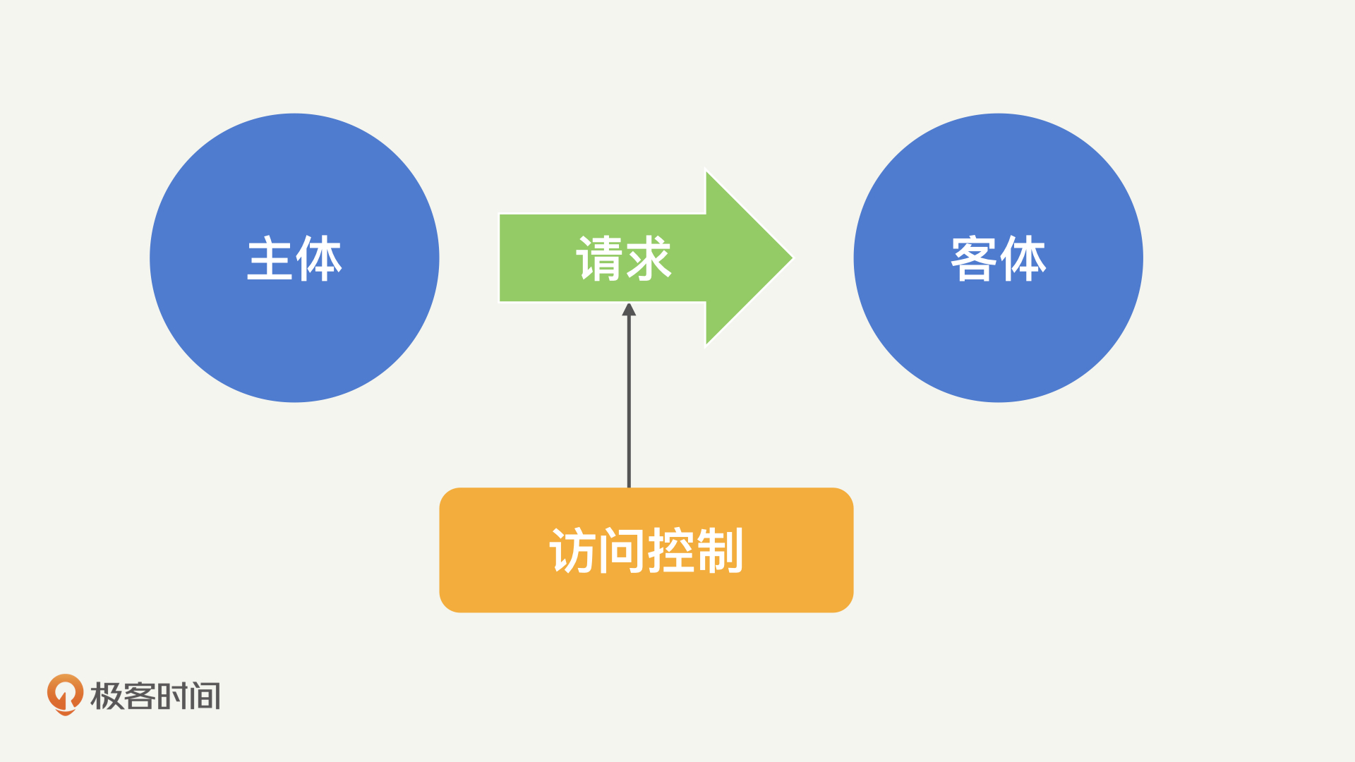 首先,在探讨访问控制的机制之前,我们先要来了解一下,访问控制的场景是什么。这也是你去理解访问控制机制的一个基础。我把访问控制模型抽象成了下图的模型,你可以看看。具体来说就是,一个主体请求一个客体,这个请求的授权由访问控制来完成。