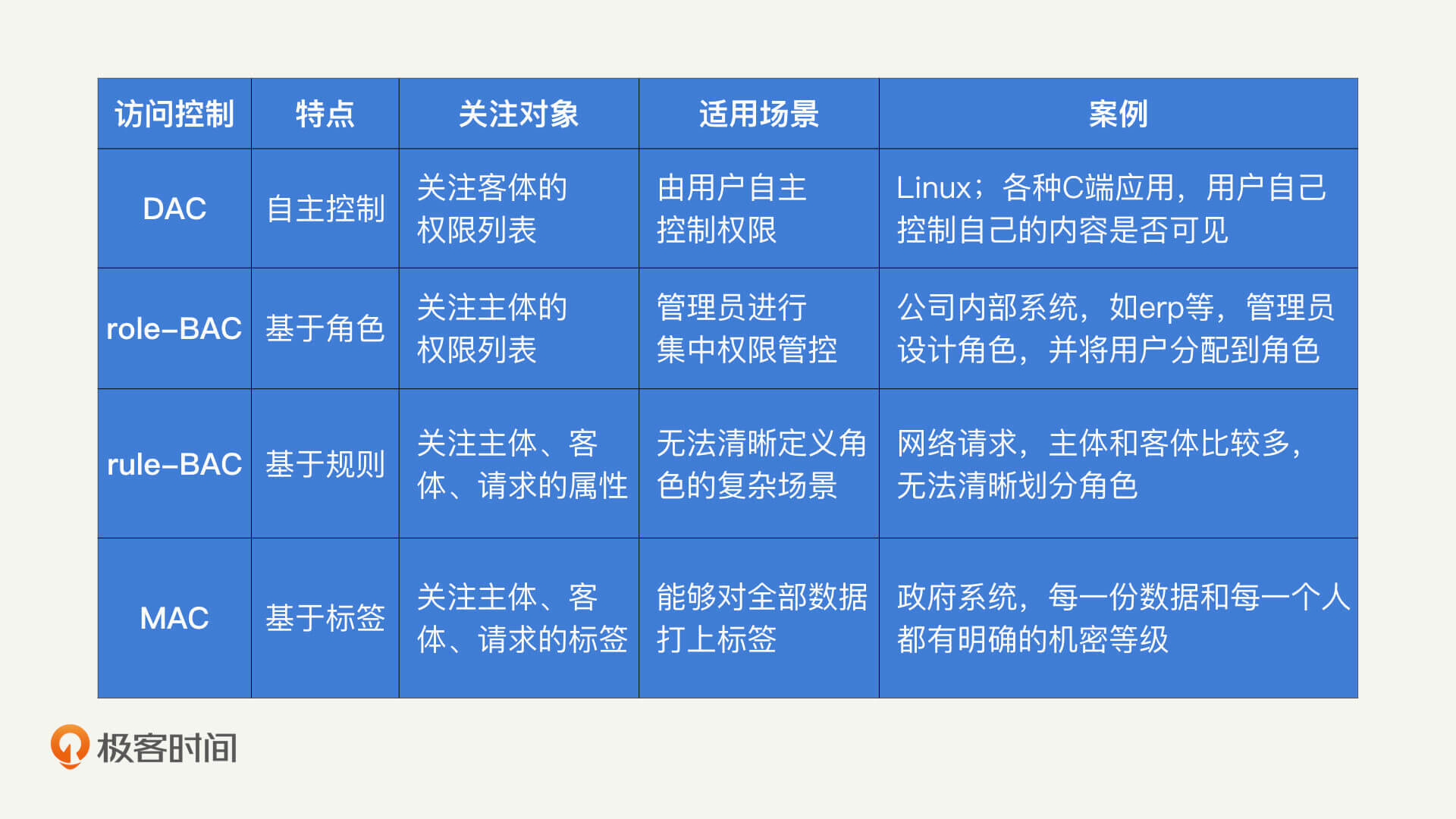 我个人认为,“授权”和“访问控制”其实是同一个概念,都是允许或者禁止某个用户做某件事情。现在行业内普遍用“访问控制”这个术语来讨论相关问题。因此,后续我们都会用“访问控制”来替代“授权”。如果你看到了这两种说法,知道它们是一个意思就可以了。