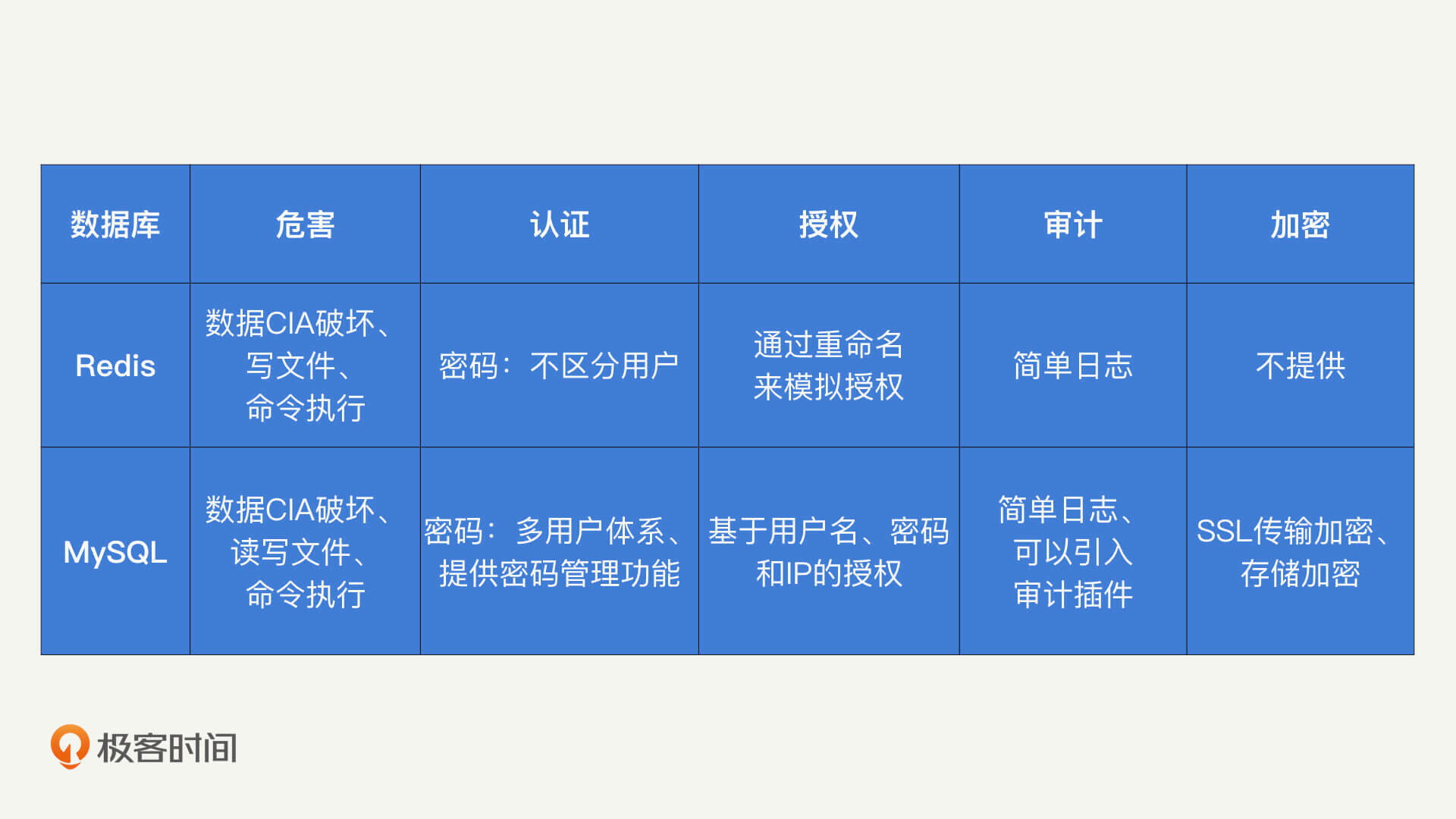 今天,我就以两种比较常见的数据库Redis和MySQL为例,来和你一起探讨数据库的安全。