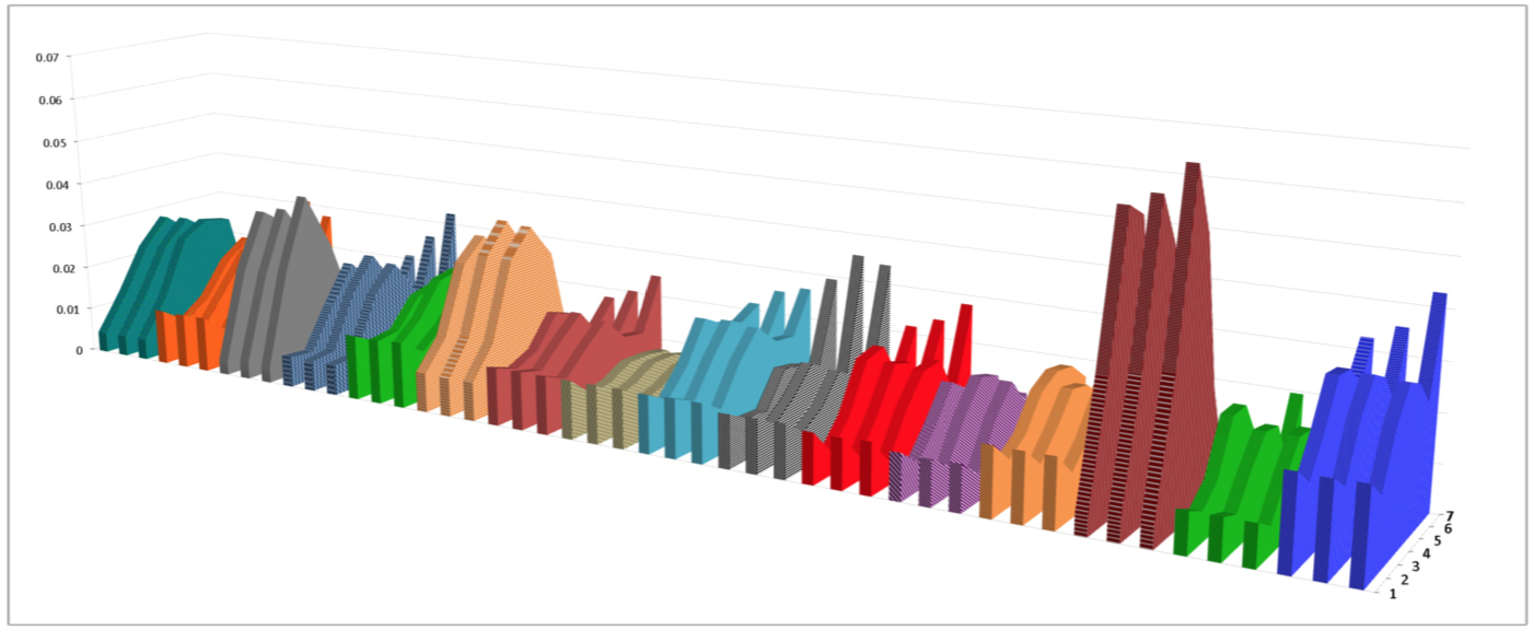 利用这样的原理,我们可以采集任何一个传感器硬件的偏差特征。比如,下图是在播放同一个音频后,不同手机的麦克风接收到的音频曲线。每一个颜色对应一个设备,可以看到不同设备之间的曲线存在较大差异,而同一设备的曲线则相对稳定。