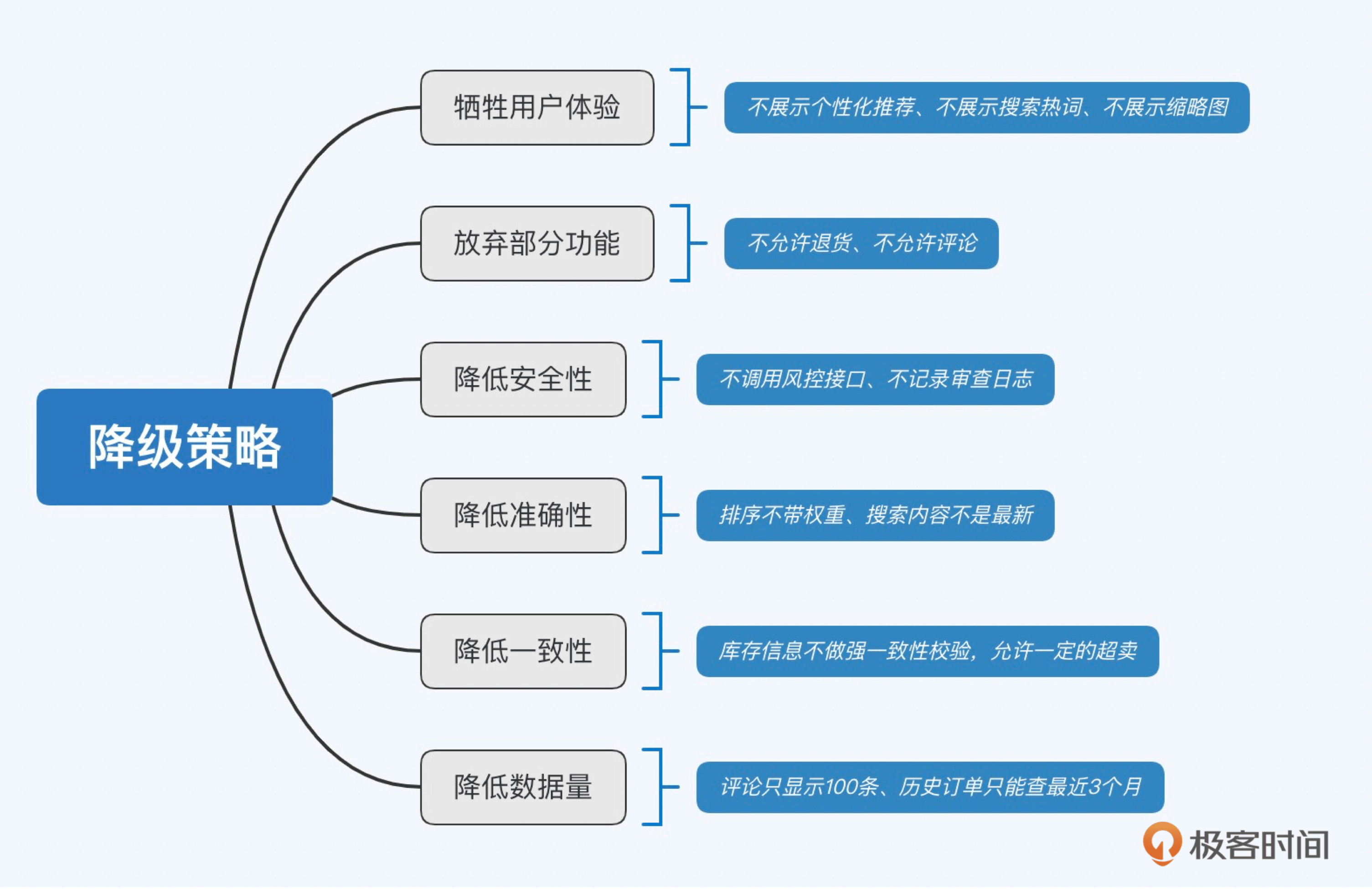 降级在互联网行业的应用非常广泛,比如某大型电商在双11当天会将退货的功能降级,以确保核心交易链路的容量充足;某生鲜公司在遇到流量高峰期时,会将一部分个性化推荐的功能降级,以确保导购链路的工作正常,等等。抽象总结可以有以下几类策略,我同时提供了一些案例供你直观地理解它们。