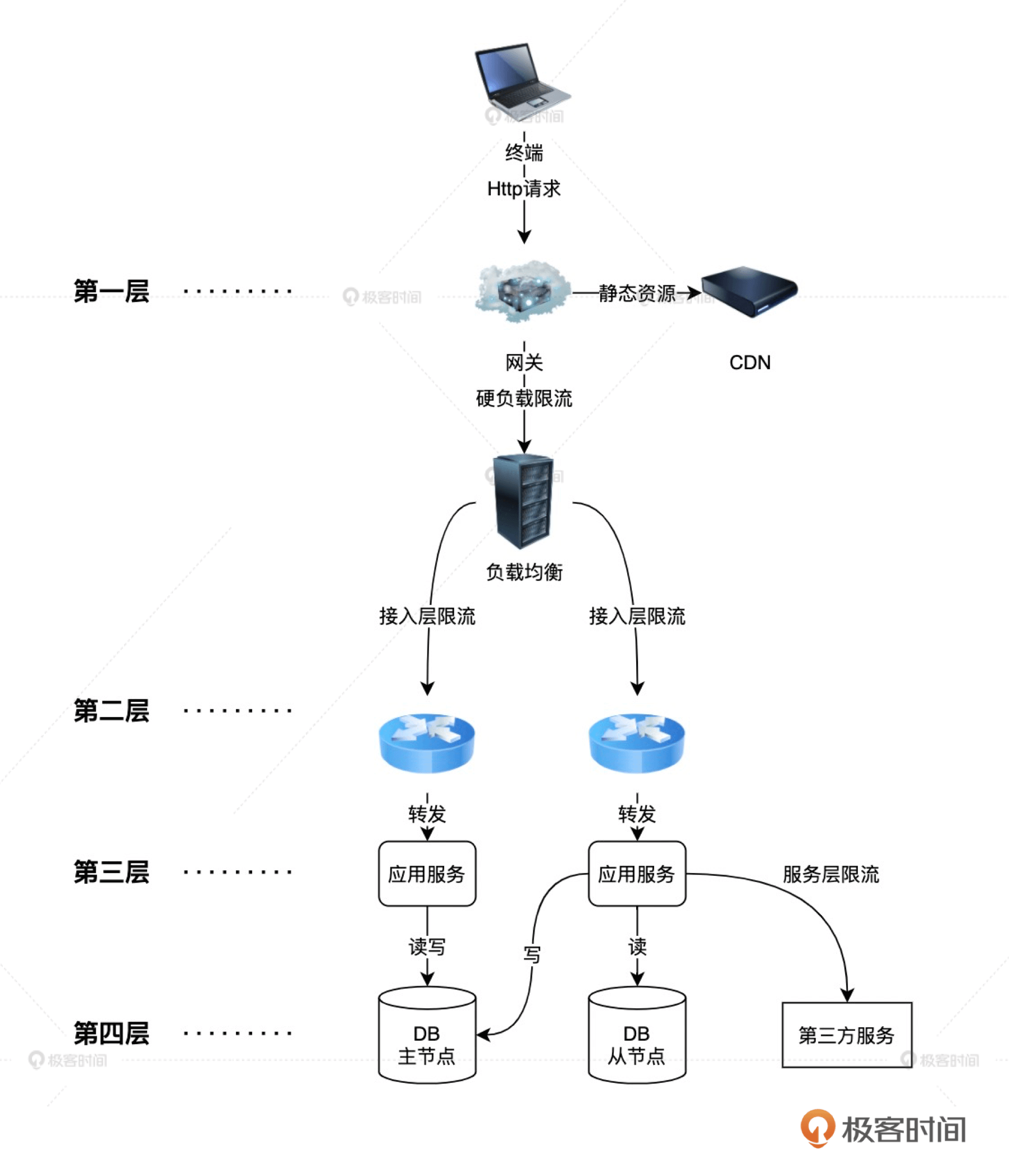 根据不同的限流位置,限流可以划分为网关层限流、接入层限流、应用层限流、数据库层限流等。我们直接来看下面这张图,图中自上而下描述了服务的流量走向,非常清晰地体现出层次化的限流思路,每个位置都恰如其分地加入了相应的限流策略,下面我具体解读一下。
