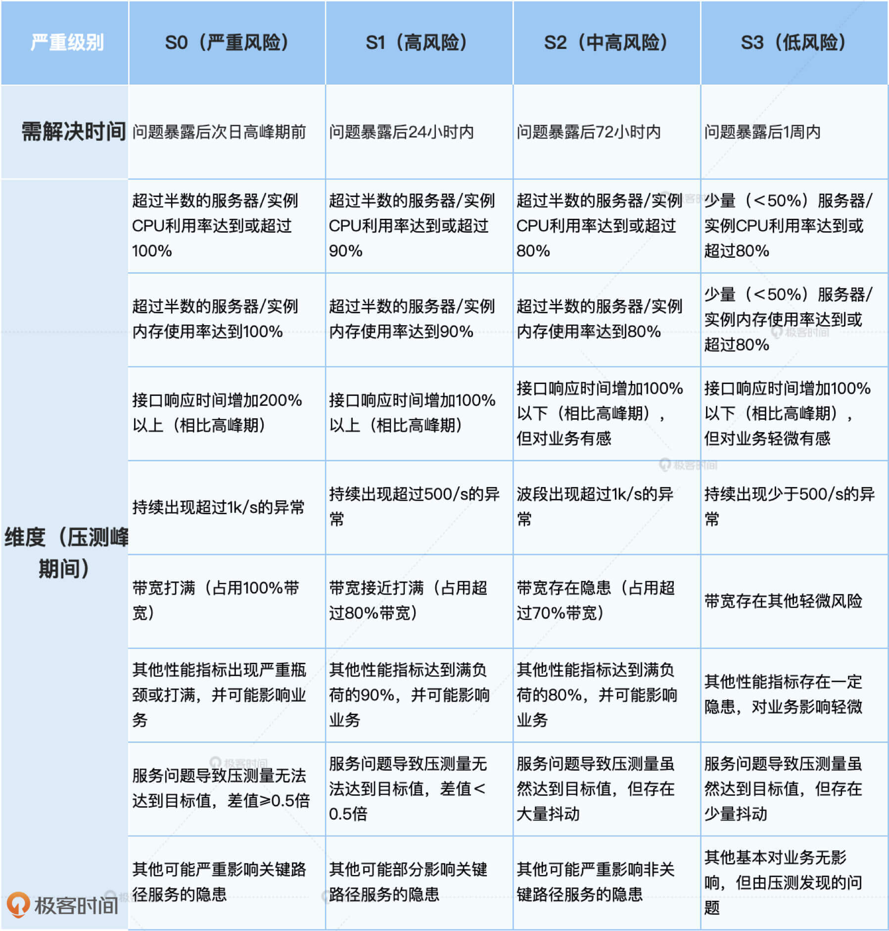 此外,全链路压测能够暴露出整体系统的容量隐患,但仅仅将问题暴露出来还是不够的,我们需要确认这些问题得到重视和解决,才是真真正正地消除了容量风险,我建立的第二项规范,就是用来驱动全链路压测时所发现问题的及时改进,称之为容量问题分级规范。