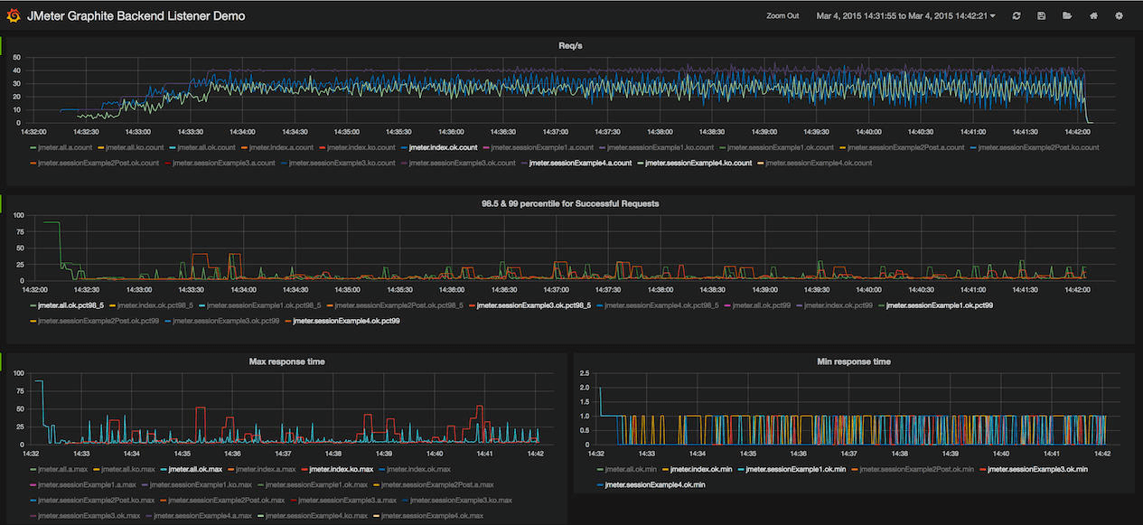 我们这套分布式压测平台实现方案,是基于JMeter的,但遗憾的是,JMeter本身并不提供图形化的实时数据展示功能,以往我们只能通过输出日志看到一些粗略的信息。在压测平台中,我们就对实时数据展示功能进行了实现,主要原理是通过JMeter的Backend Listener将测试结果实时发往InfluxDB,同时平台向InfluxDB轮询查询数据,得到实时曲线并展示给用户。