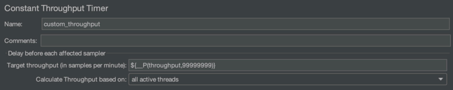 我提供的方案也很简单,依然是基于吞吐量控制器,基本的实现原理是将吞吐量限制值设为占位符(如下图中的${__P(throughput, 99999999)},throughput就是占位符),利用JMeter的BeanShell功能,通过执行外部命令的方式,在运行时注入具体值,达到动态调节吞吐量的目的。