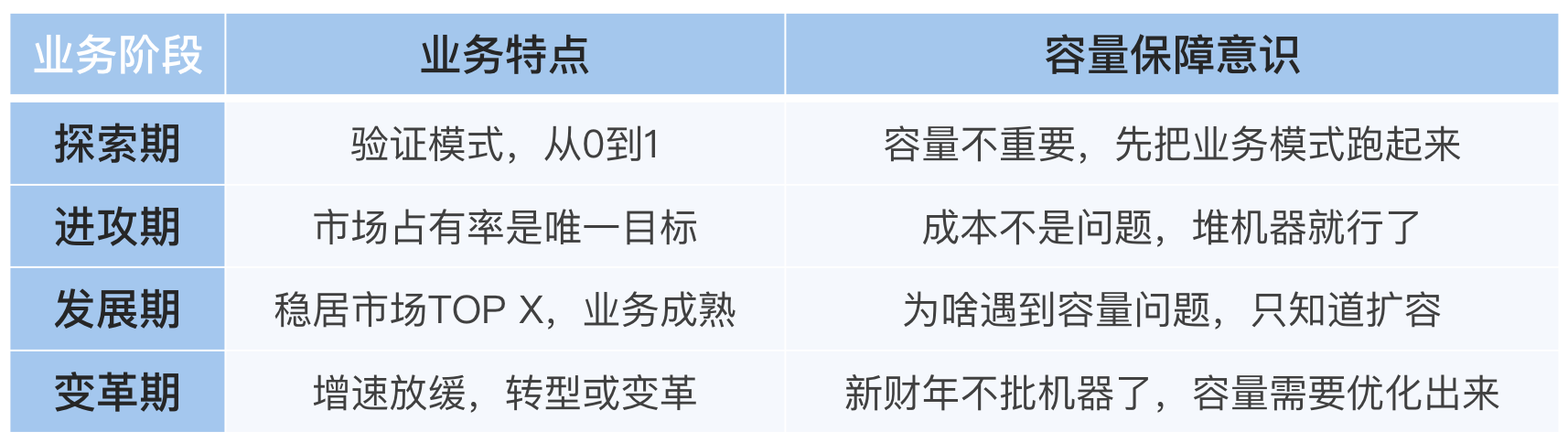 我们顺着GOC团队的建设思路再进一步思考,容量测试团队是否也有必要化零为整,变成一个独立的横向支撑团队呢?我所经历过的公司有的是,有的不是,这个问题的本质其实是需要阶段性考量的,我把开篇词中的一张表格替换成容量保障意识的内容再回顾一下,来看一看有什么启发。