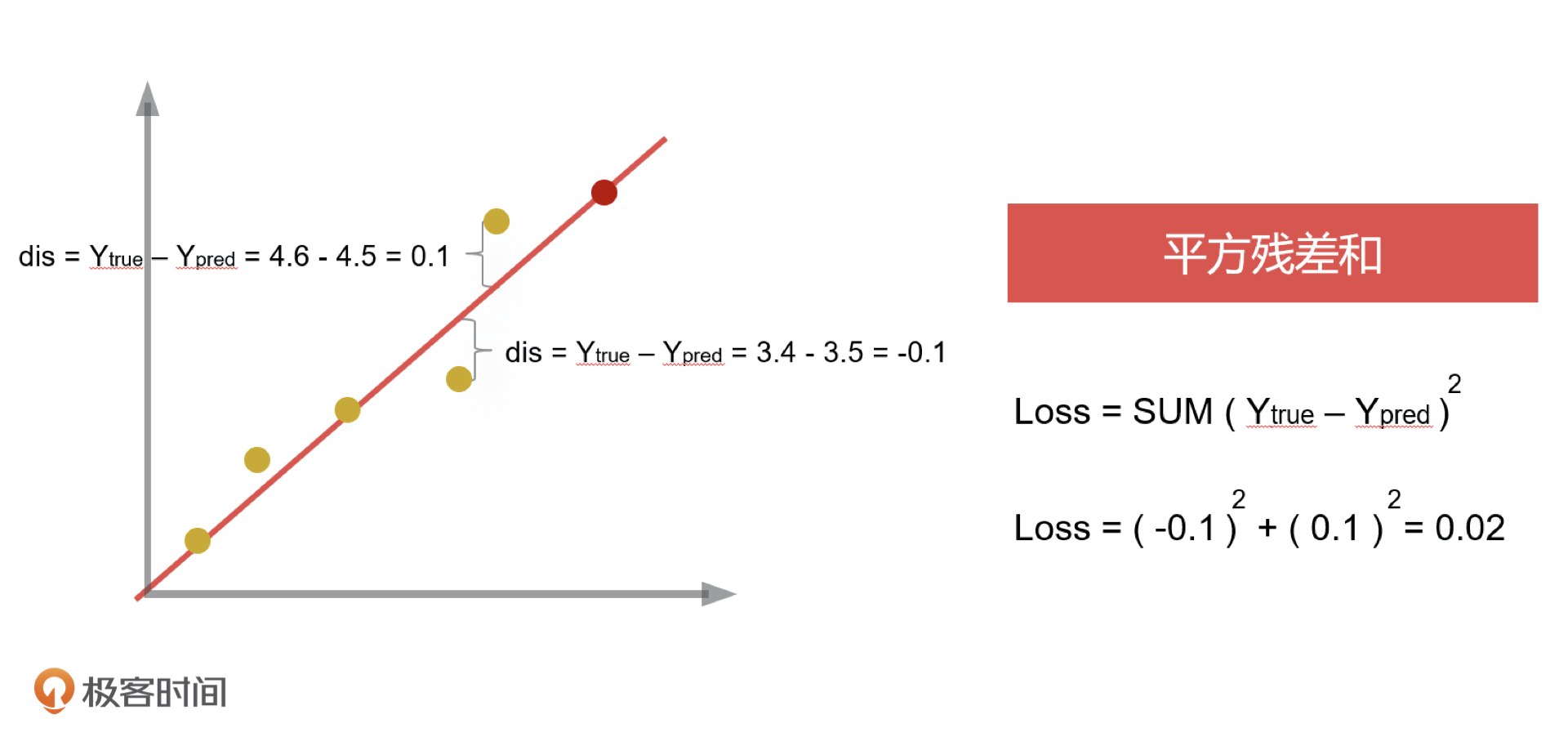 这个公式在机器学习中就被称作损失函数,也叫代价函数。损失函数就可以用来评价模型的预测值和真实值之间不一样的程度,损失函数值越小,模型性能越好。而平方残差和(RSS,Residual Sum of Squares)是一种最常见的损失函数,它可以用来计算每一个样本点的结果值和当前函数值之间的平方差,差值越小,回归模型做得就越好。差值的具体计算方式,我们只要了解就可以了,我把相应的图片放在了下面,你可以看一看。