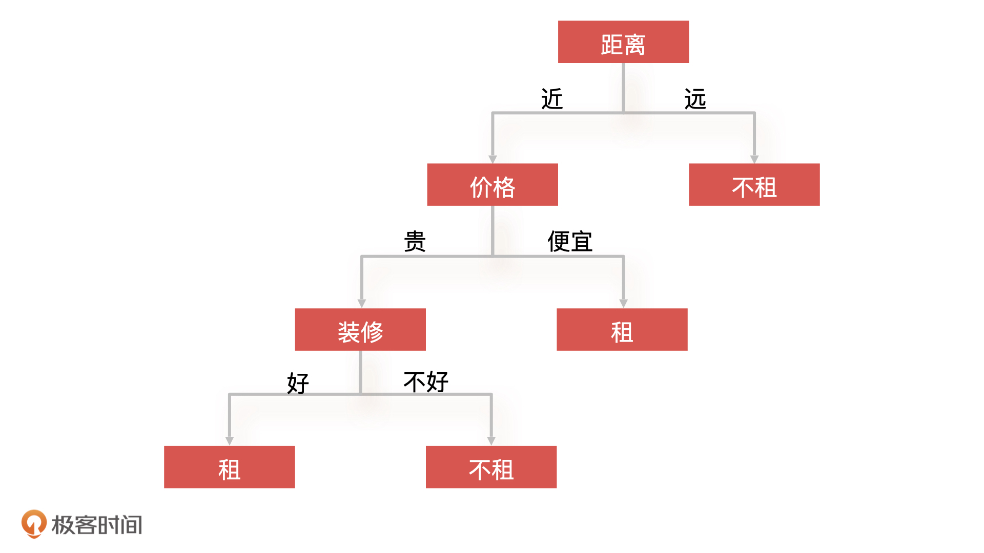 你会发现,我们的决策树一下子变“大”了,判断这个房子的过程就变成了,先看价格,再看装修,最后看距离。我们发现,即使决策树的结构发生了变化,可我们还是会得到之前的结论:不租,所以,决策树的构造只会影响到算法的复杂度和计算的时间,而不会影响决策的结果。