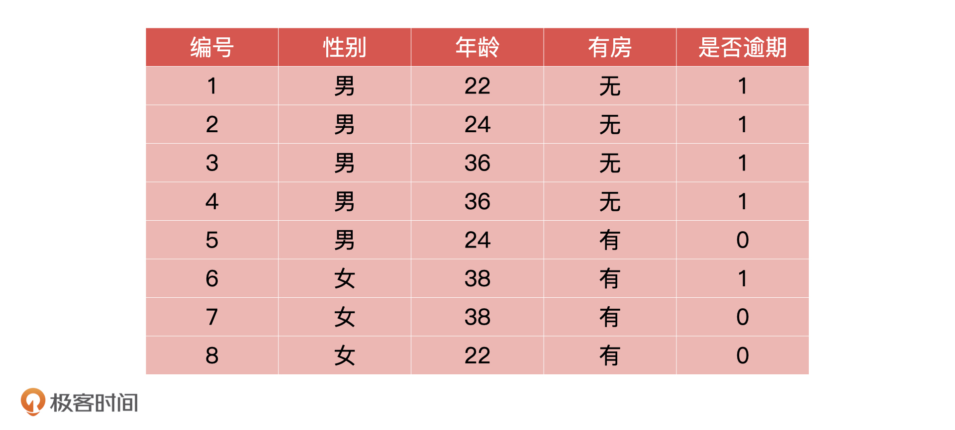 假设我们得到的用户历史数据如下所示。对于这个表格,我再补充解释一下,过去的信贷数据应该包括申请数据、金融产品相关数据等等。年龄,是否有房这些都属于申请数据,是包括在信贷数据里的。