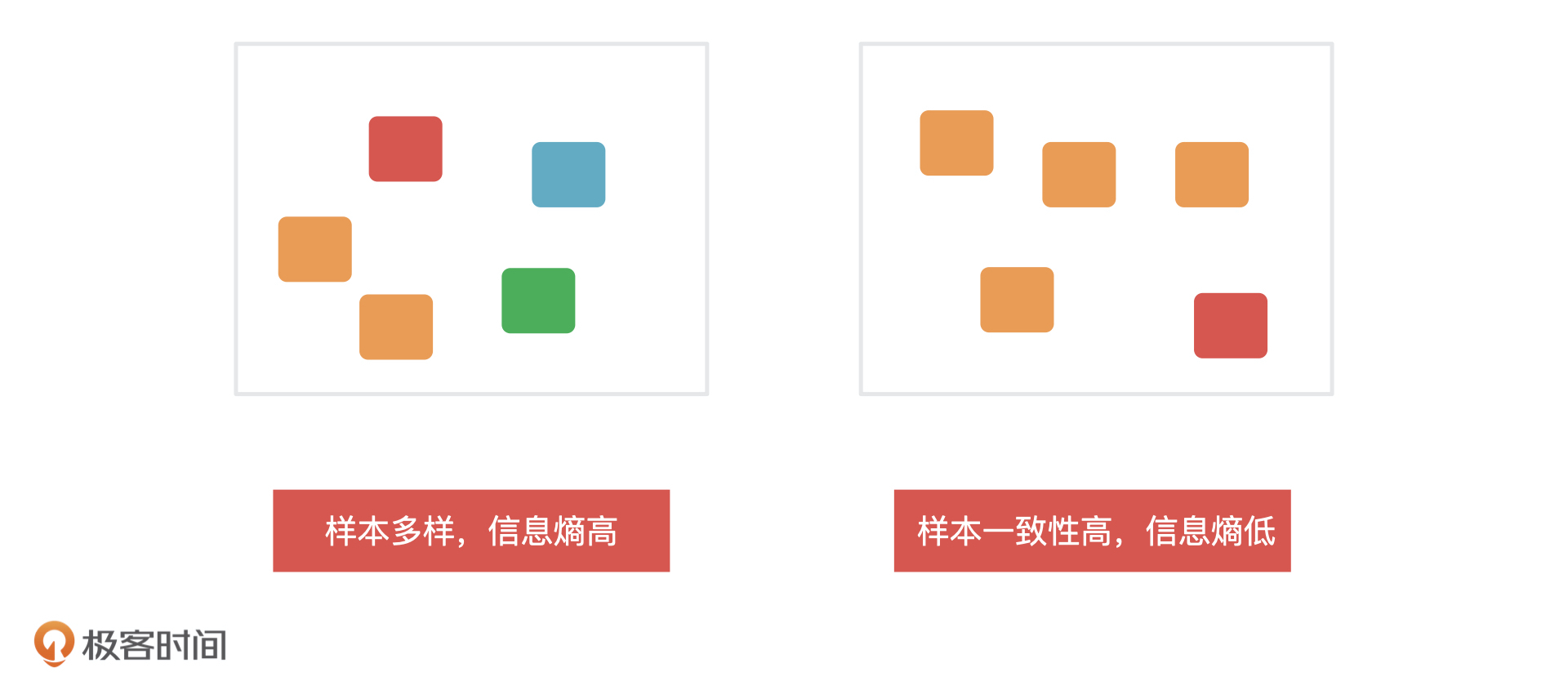 我们一般会在特征选择和决策树的生成阶段,通过信息熵来决定哪些特征重要以及它们应该放到哪个节点上,因为信息熵是用来衡量一个节点内信息的不确定性的。一个系统中信息熵越大,这个系统的不确定性就越大,样本就越多样,你也可以理解成是样本的纯度越低,信息熵越小,系统的不确定性就越小,样本越趋于一致,那样本的纯度就越高。