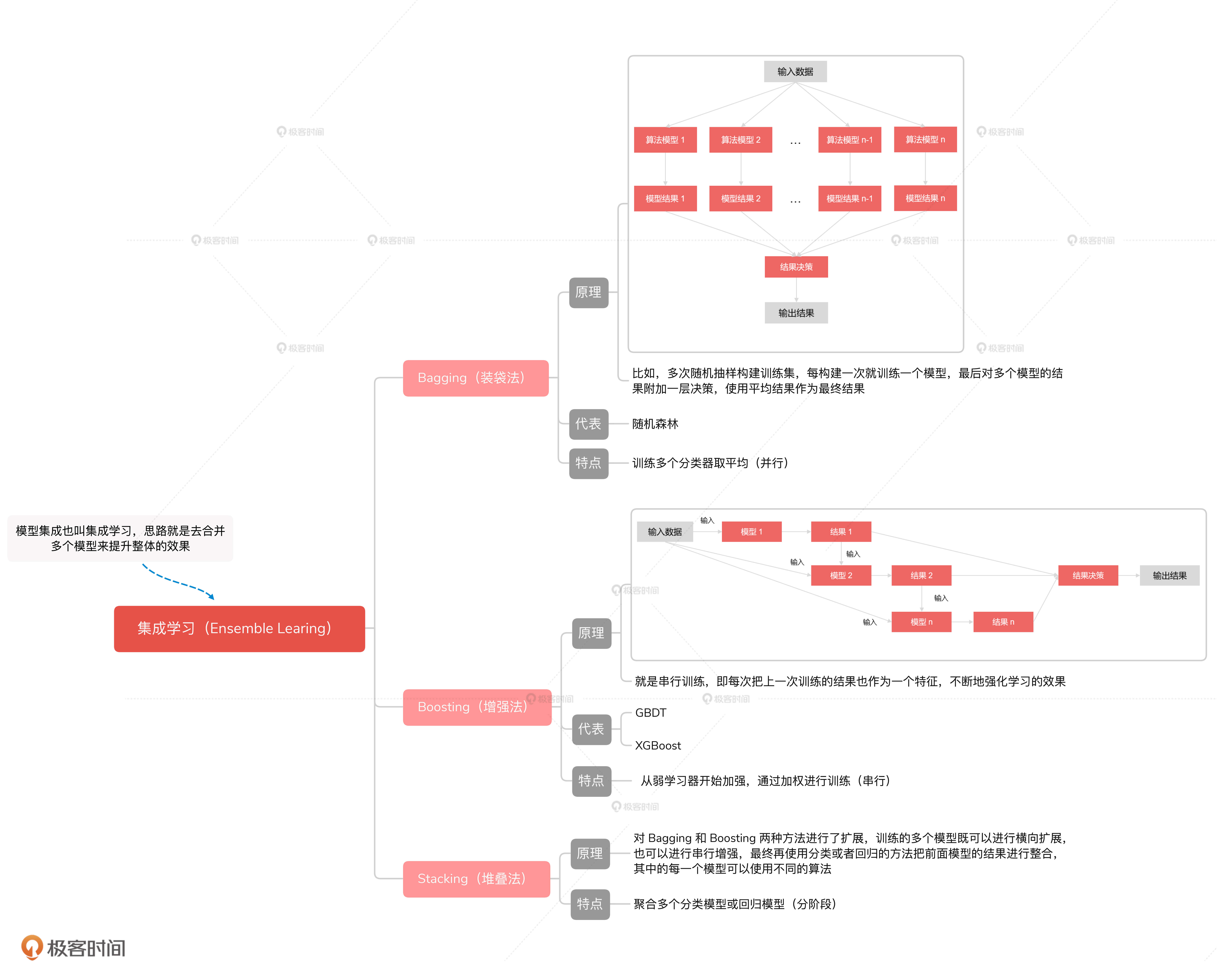 集成学习的内部由很多弱监督模型组成, 某一个弱监督模型只在某一个方向上表现比较好,当我们把这些算法合而为一的时候,就会得到一个各方面都会表现较好的模型。集成学习的算法有很多,随机森林是其中比较有代表性的一种。我在下面整理了一个集成学习的思维导图,你可以了解一下。