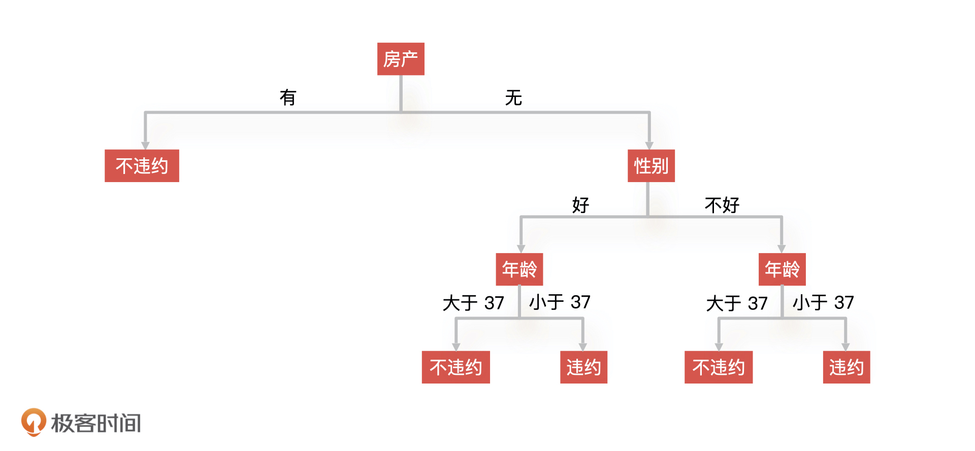 假设年龄在 37 的时候 Gini 系数最小,等于 0.511,那么年龄这个特征的条件分支就是小于 37 和大于 37。