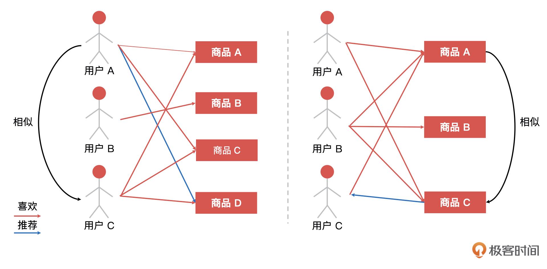 通过这个表格,我们能很直观地看到,用户 A 和用户 C 都喜欢商品 A 和商品 C。由此,我们可以猜测用户 A 和用户 C 的兴趣偏好可能相同。这个时候,我们就可以把商品 D 推荐给用户A。