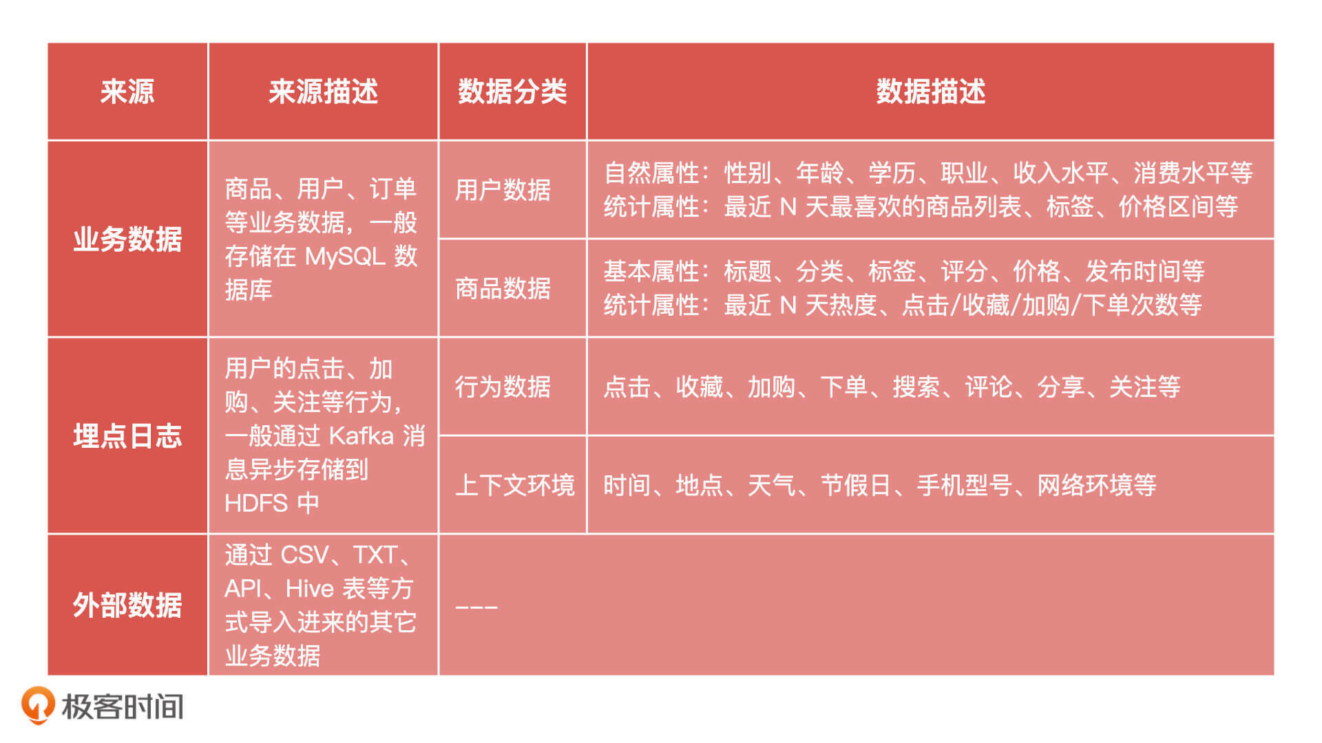 这些数据的来源一般包含三类:业务数据、埋点日志和外部数据。并且每个来源的数据都有着详细的数据分类,这些数据会应用于机器学习的离线预估模型训练和实时模型预估计算。具体内容我都总结在了下面的表格中,你可以看一看。