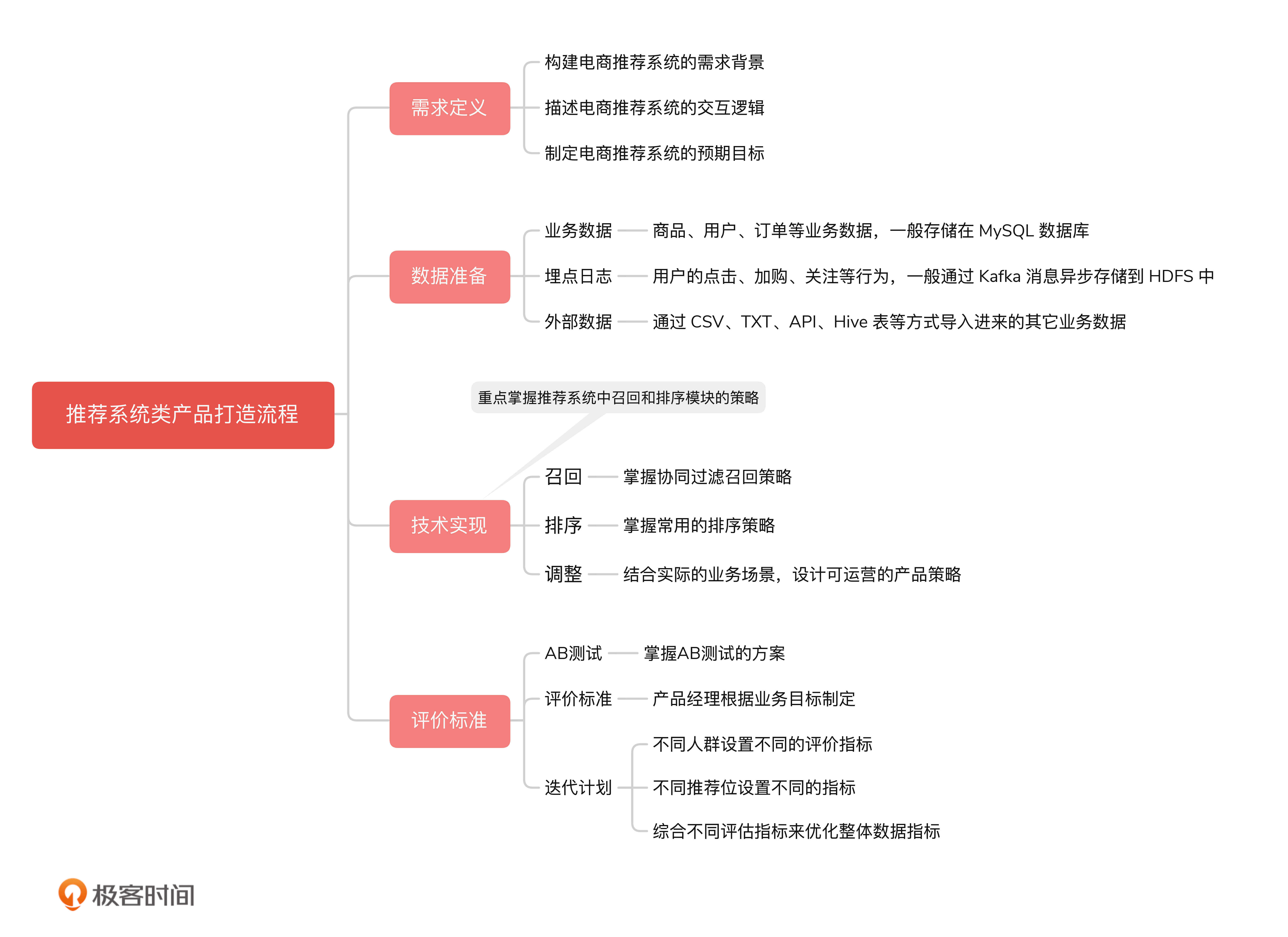 第一,我们要能够清晰地设计需求:需求定义要明确需求背景、功能描述,以及预期的收益。- 第二,我们要能够理解数据:在推荐系统的数据准备阶段,产品经理要关注用户前端的埋点日志,提前设计埋点,以及给研发工程师提需求收集行为日志。- 第三,我们要能够对通过 AB 测试来评估推荐系统的效果,然后做出分析再给予持续的迭代计划。