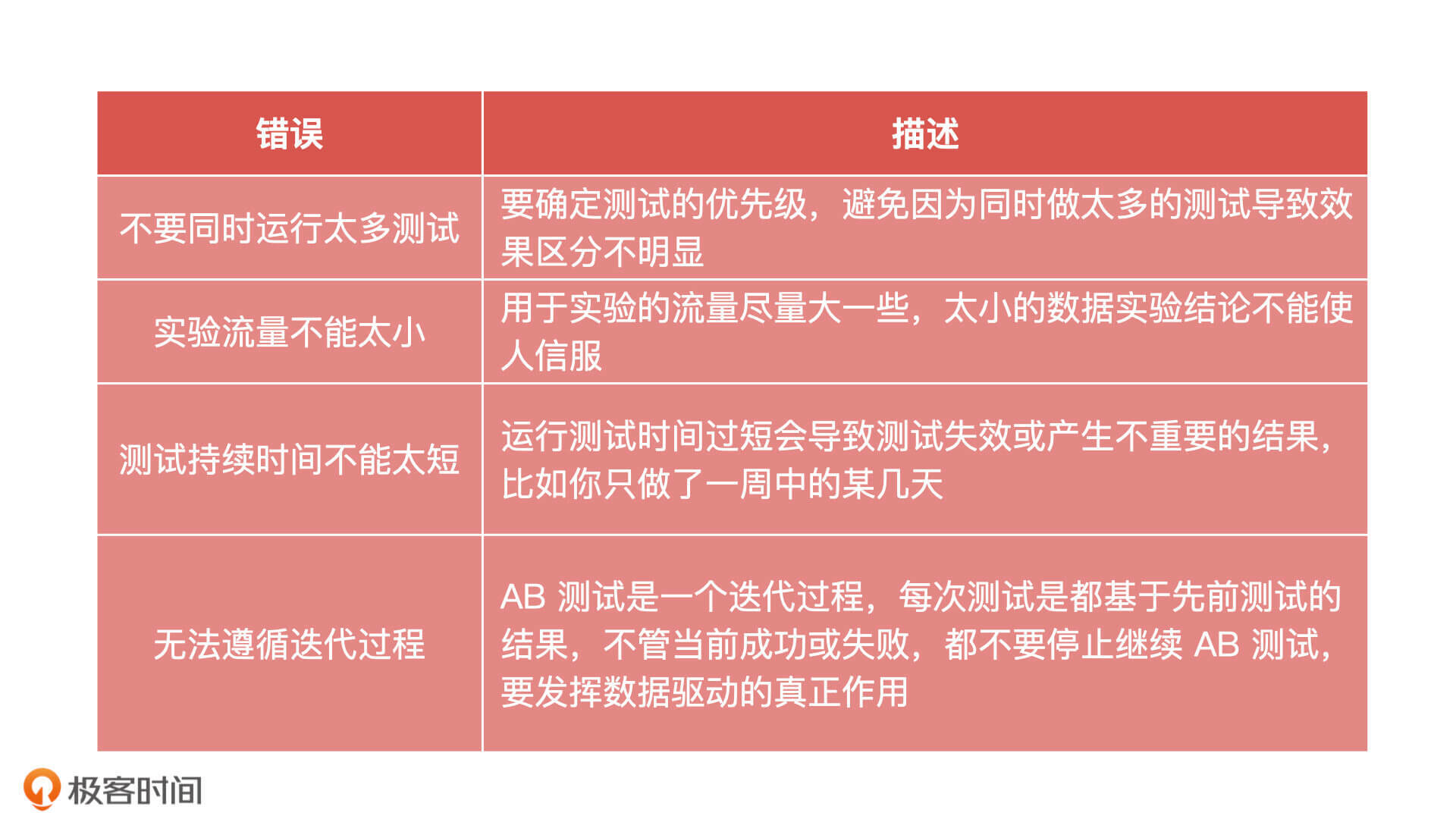 除了这三点,我也把做 AB 测试时常见的几个错误总结在了下面,你在做AB测试的时候要尽量避免。