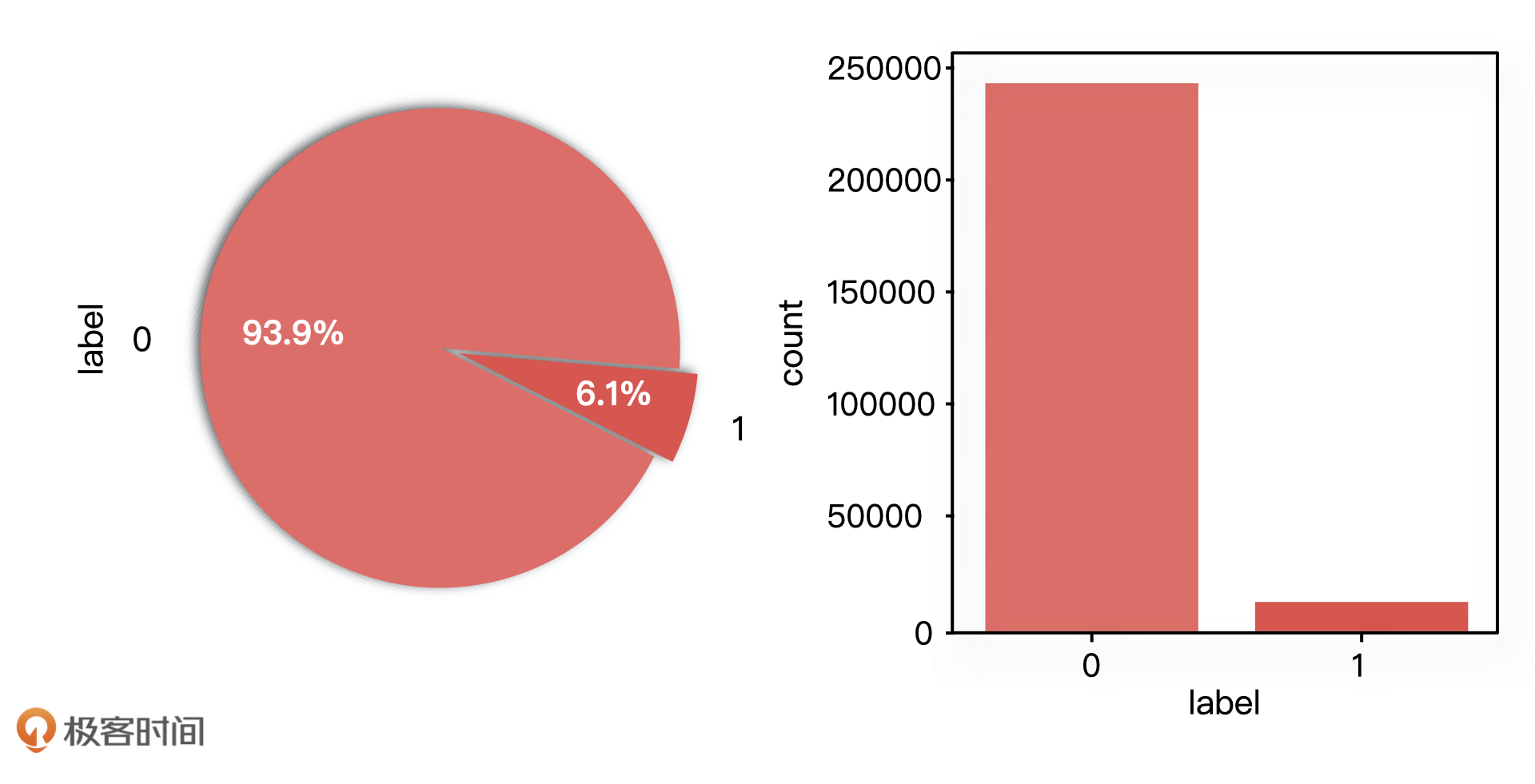 我们首先要做的,就是通过整体数据的分布情况,来判断正负样本的均衡程度。在实际开发过程中,我们通常会利用 Python 的 Matplotlib 库来分析数据的分布。下图就是正负样本的数据分布图。