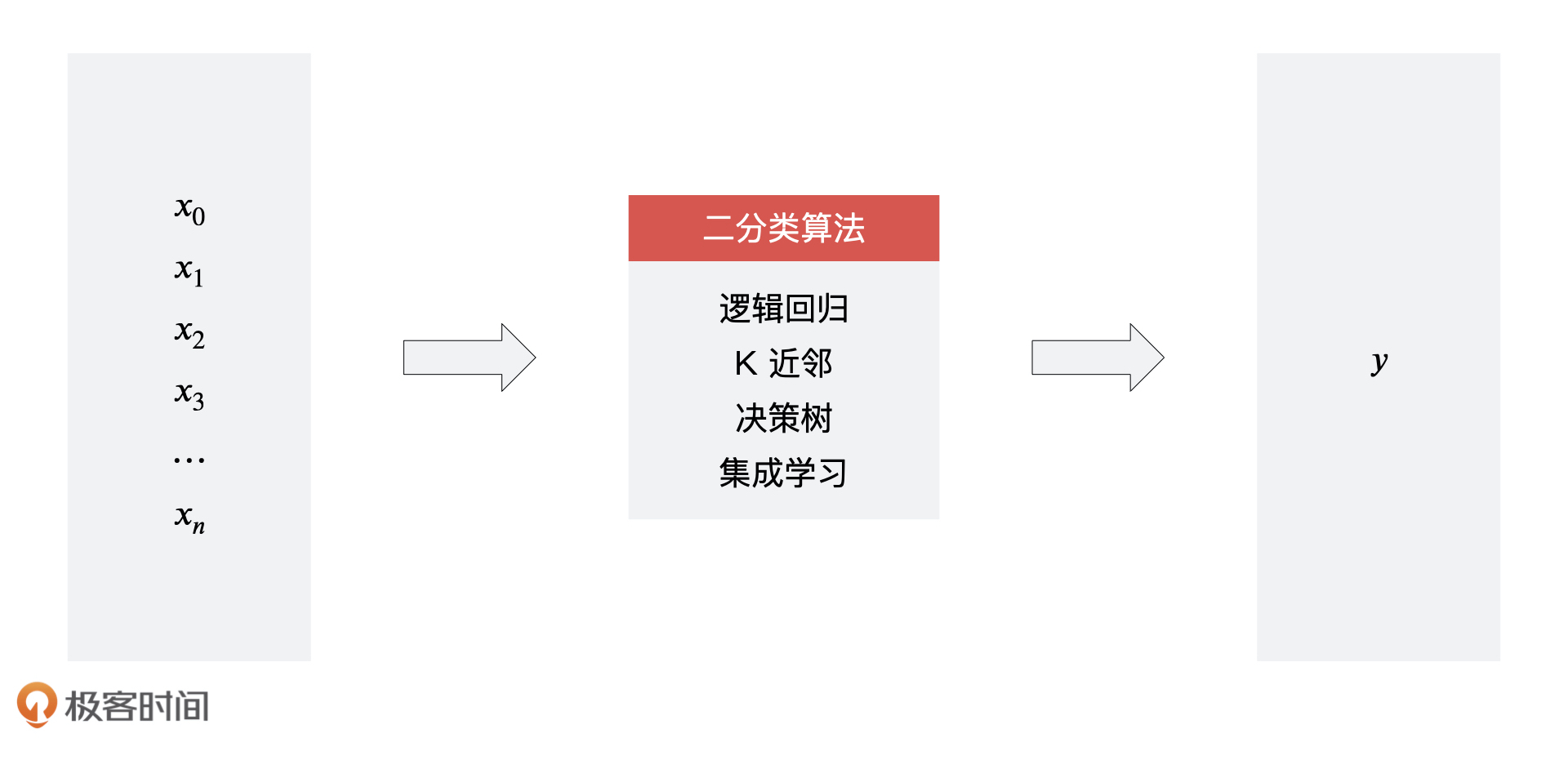 对于算法的选型,我们可以选择之前课程中学习的算法,如逻辑回归、K 近邻、决策树、随机森林等等。每一个算法都可以训练出一个 数学公式: \( x \)(样本)到 数学公式: \( y \)(标签)的函数,然后在使用的过程中,我们只需要通过这个函数导入一个未知的 数学公式: \( x \),就可以预测出对应的 数学公式: \( y \) 标签的概率,然后我们再将概率大于 0.5 (如果要求更高的复购概率可以提高 y 值)的 数学公式: \( y \) 值表示成复购,将概率小于 0.5 的 数学公式: \( y \) 值表示成不复购。