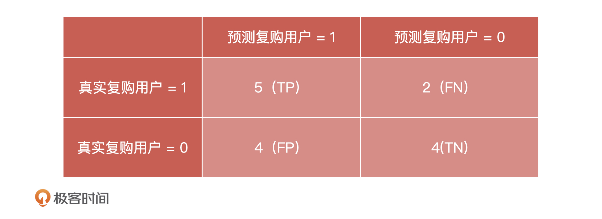 下面,我们就分别说说对于复购模型来说,这些指标该怎么求。首先,我们来说混淆矩阵。假设,这个复购模型对 15 个样本进行了预测,预测的结果如下: