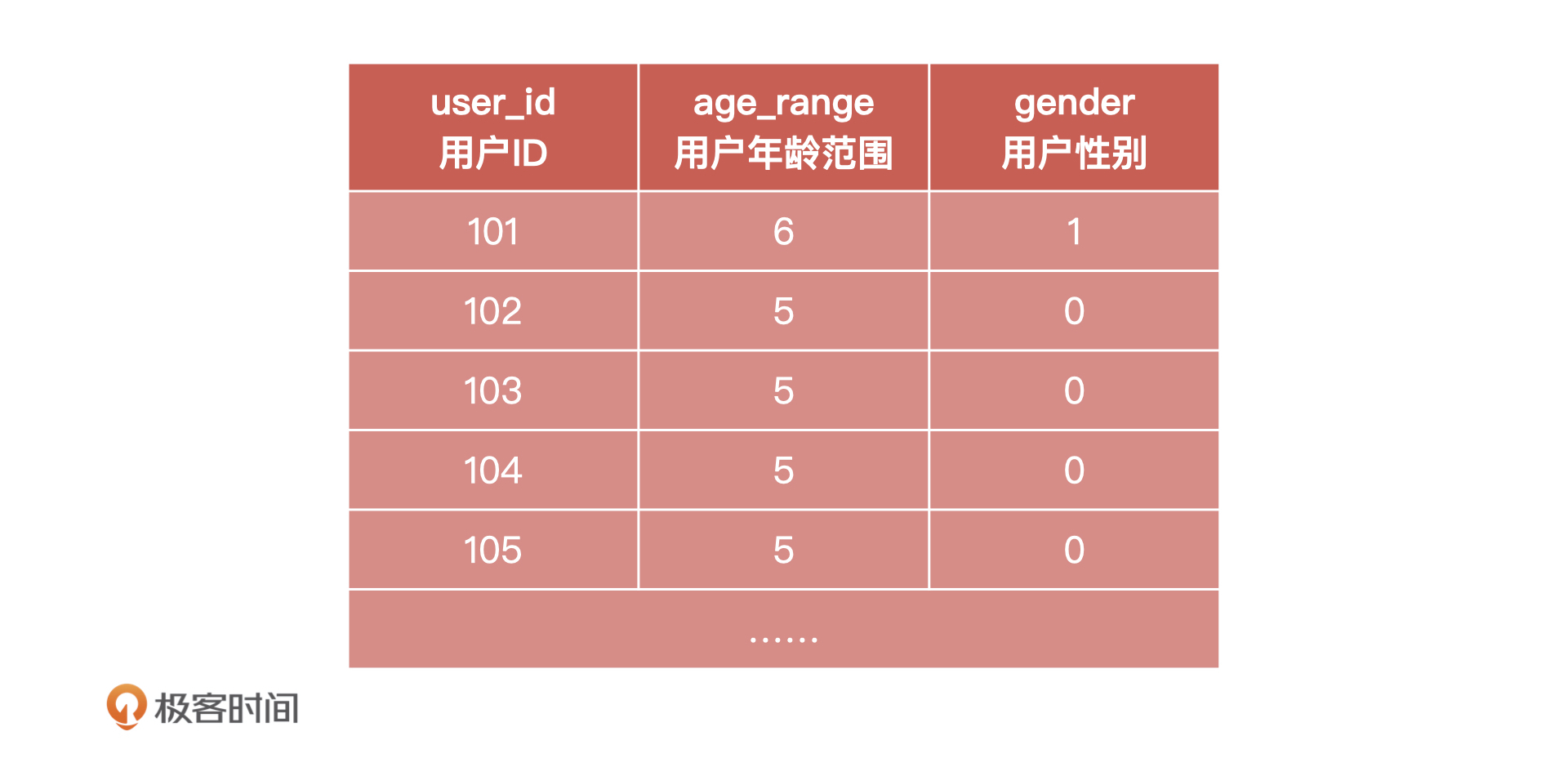 这里我要补充说明两点:用户年龄的取值范围是1、2、3、4、5、6。其中,1 表示0-15、2 表示16-25、3 表示26-35、4 表示36-45、5 表示46-55、6 表示56及以上;用户性别的取值范围是:0、1、2。其中,0 表示女性、1 表示男性、2 表示未知。