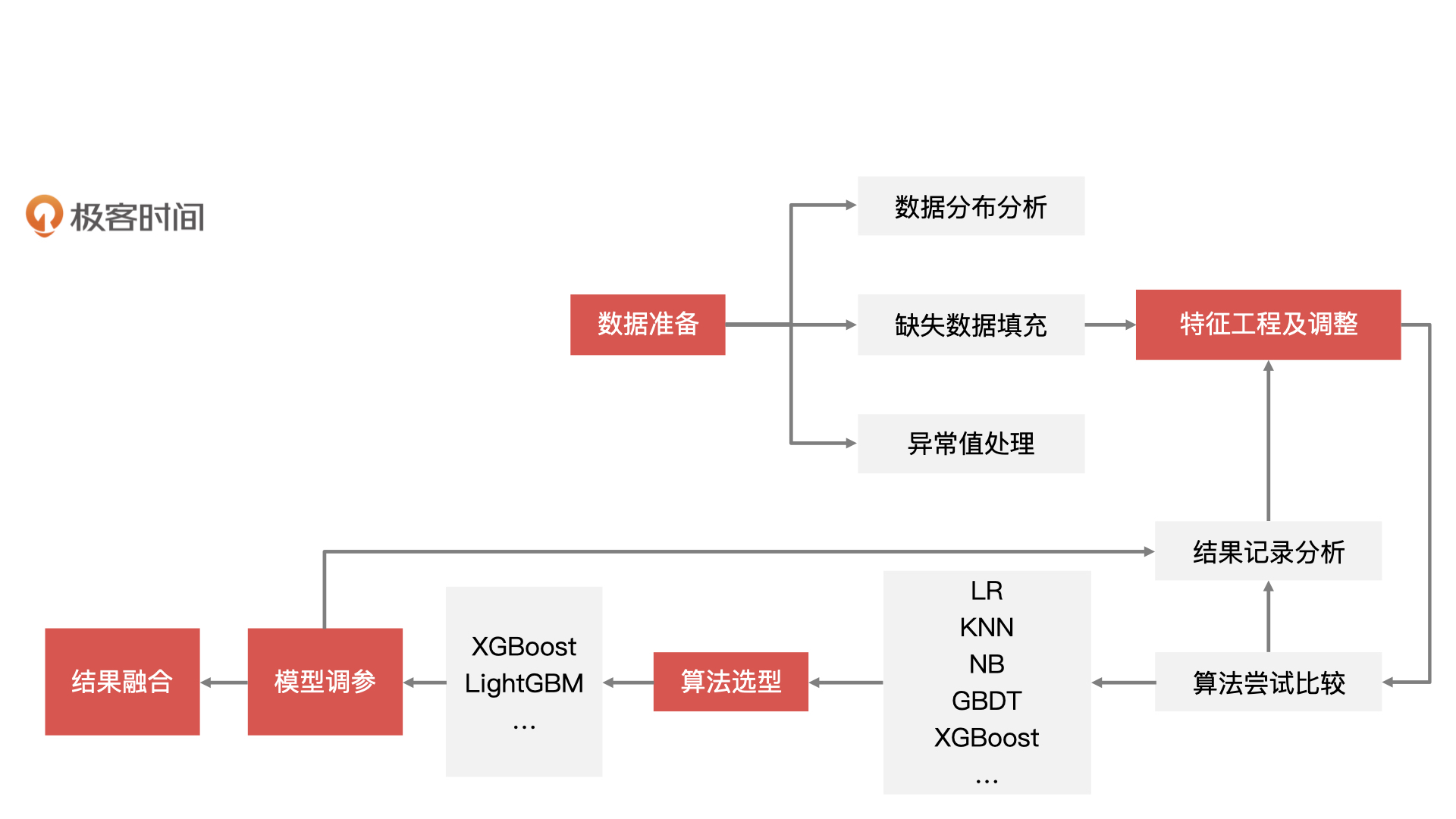 机器学习项目开发的一般流程是数据准备、特征工程、模型训练、模型验证,以及模型融合。下图就是一个机器学习项目流水线式的开发流程,我们今天要实现的高潜用户复购模型也是基于这样的流程来构建的。
