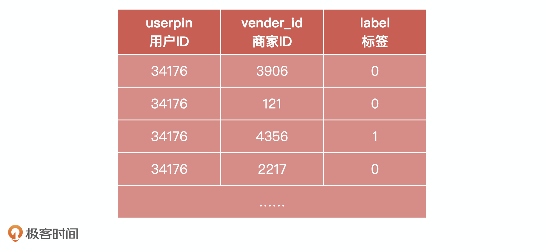 那我们今天要讲的这个案例,它的数据样本主要抽取了“618”之前和之后 3 个月内,匿名用户的购买行为日志数据、用户画像数据,以及是否为复购用户的标签。这些样本数据会以用户行为日志表、用户属性特征表,以及用户复购统计表的形式展示出来。