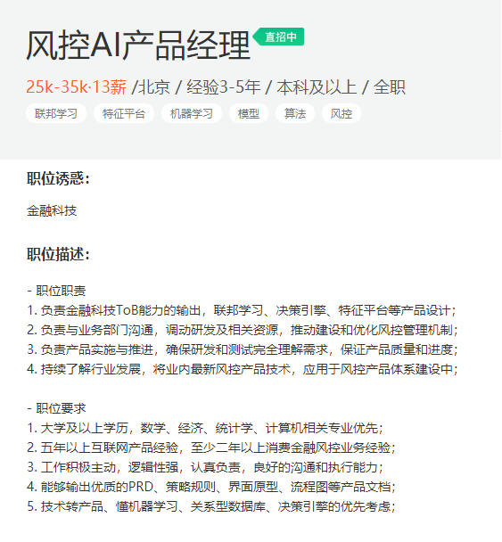 在岗位方面,因为互联网金融的核心是风控,而风控领域的产品经理岗位,又可以细分为风控策略产品、系统产品,随着 AI 能力的普及,又有了风控 AI 产品经理等等岗位。如下是一张风控AI产品经理的JD,你可以看一看。