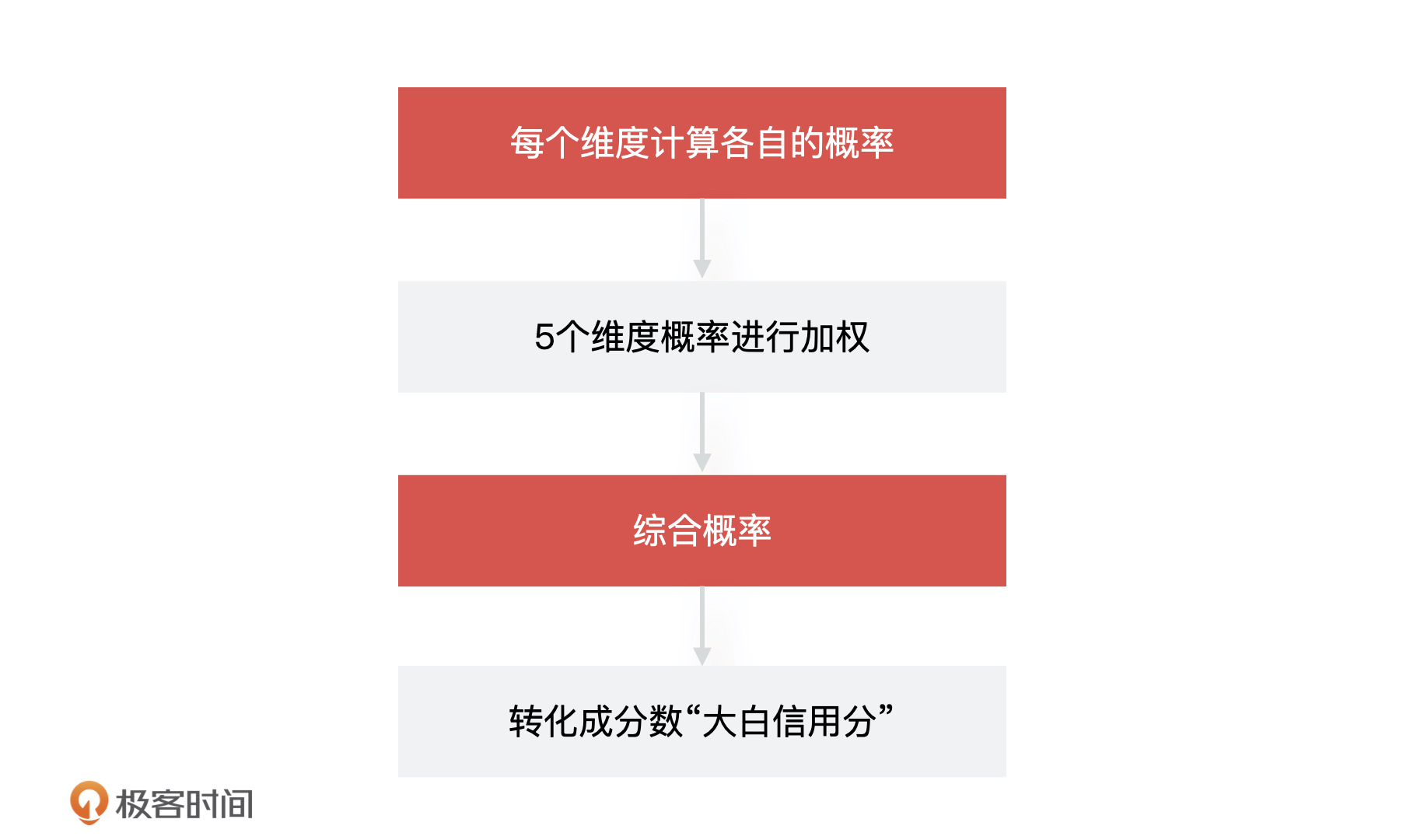 在建模之前,我们先假设一个信用场景,比如通过“大白信用分”来决定用户是否可以免押金租相机。这个场景就是一个二分类问题。它的核心思路是,计算出用户在“大白信用”5 个维度上的违约概率,然后把它们综合起来计算出一个最终概率,再把它转化成一个实际的得分,也就是这个用户最终的“大白信用分”。