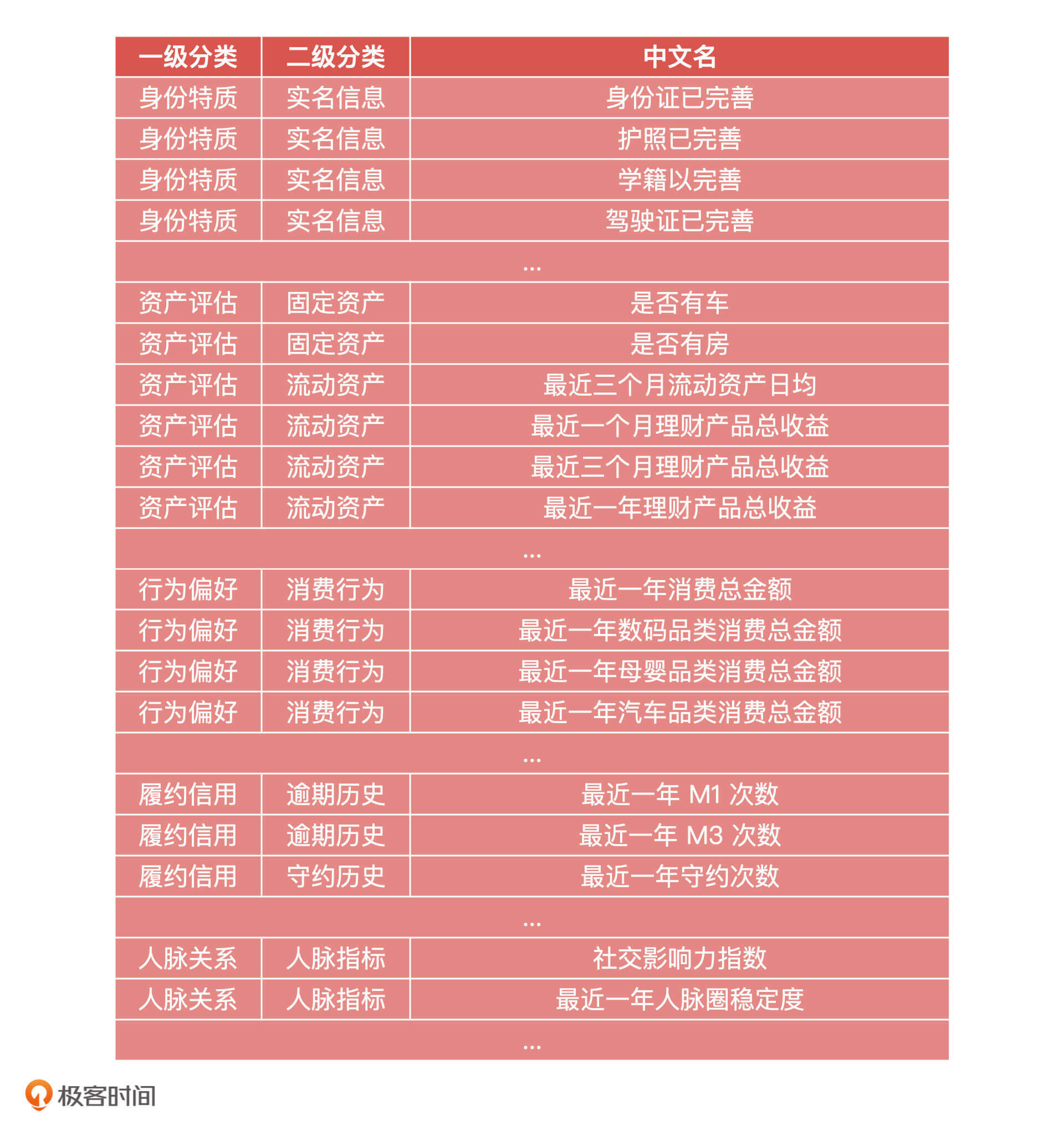 第三是行为偏好:就是通过你的消费、缴费还款、公益活动等行为,判断你的行为特点,比如从消费偏好上看出你消费的高低。这部分数据对产品后续决策有很大的参考价值。