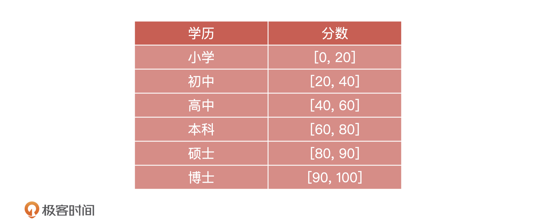 如表格所示,我们把100分分成6段,小学是 0~20,初中是 20~40,高中是 40~60,以此类推,我们直接把字符串映射到一个个的分段区间中就可以了。这里的具体取值按照业务常识设置的,我们只要做到逻辑上没有问题就行了。