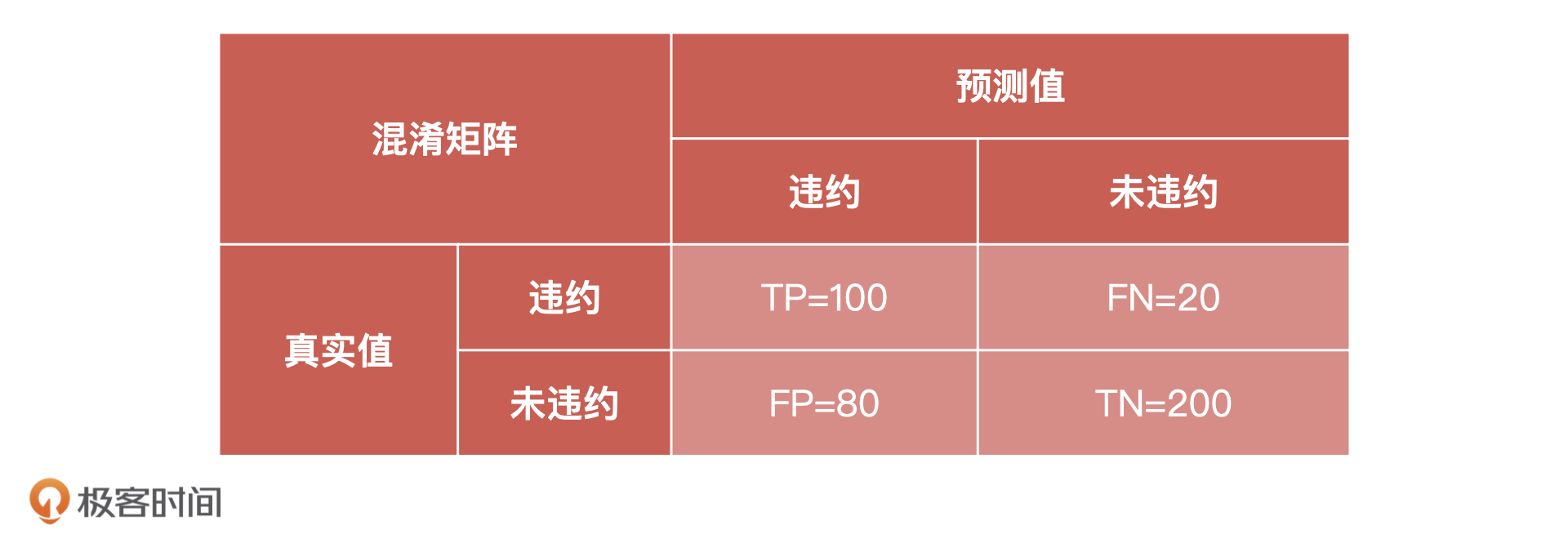 比如说,在得到的预测结果中,60分为切分点,60以下我们认为会违约,60分以上我们认为不会违约,我们预测可能会违约的是180人,不会违约的是220。但在实际表现上,违约有 120 人,未违约有 280 人,相应的混淆矩阵如下: