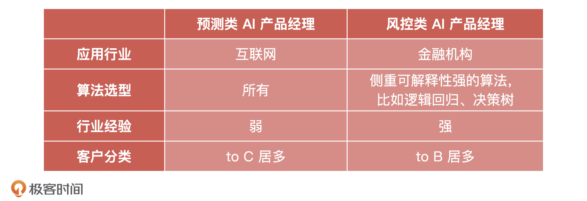 并且,我也把这节课和上节课产品经理岗位之间的区别总结在下表中,希望你能更直观地理解。