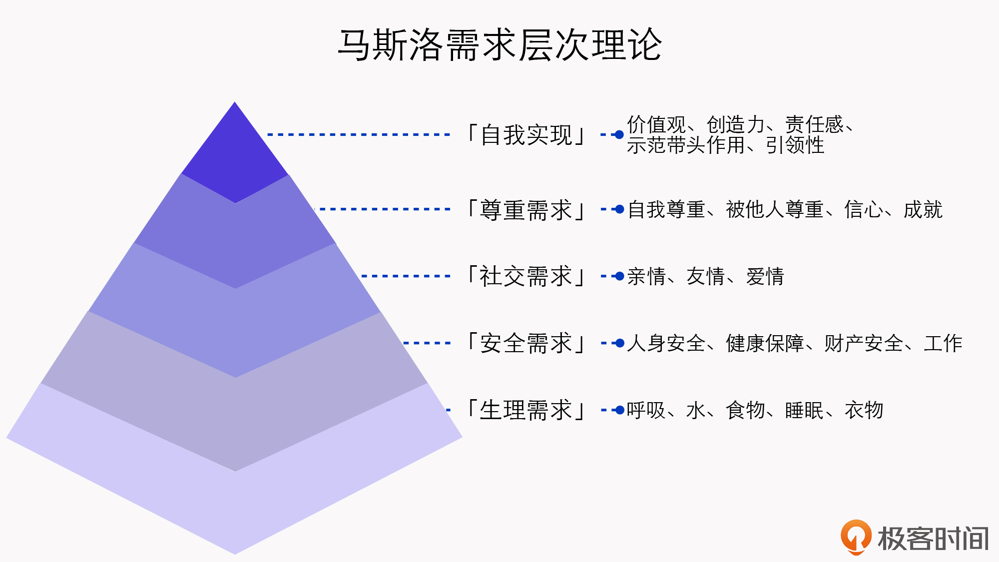 这个理论你应该比较熟悉,它是美国心理学家亚伯拉罕·马斯洛创造一种金字塔式的需求理论,由下至上分别是生理需求、安全需求、社交需求、尊重需求以及自我实现,分别对应了人在现实生活中不同阶段、不同时期所面临的核心诉求。