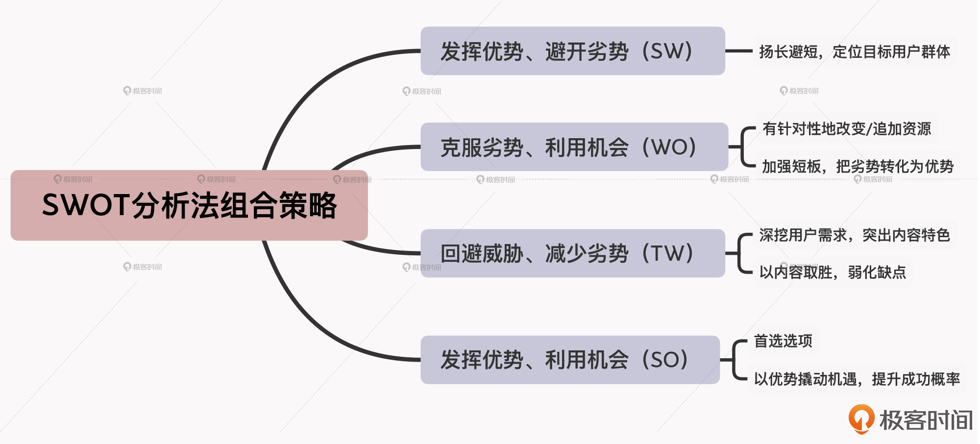 那么具体要如何进行匹配分析呢?我们可以把SWOT法中的四个关键要素两两组合起来。