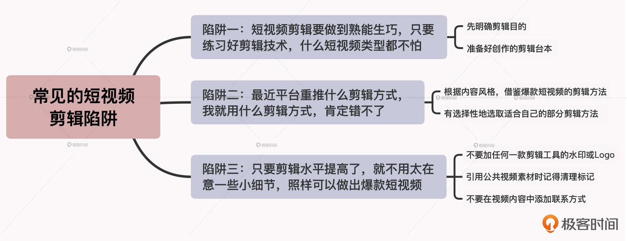 前面两节课,我们利用视频化剪辑的三大公式,了解了短视频剪辑的底层逻辑,并根据效果反馈法掌握了快速习得短视频剪辑技巧的四种方法。不过,在短视频剪辑的过程中,我们仍然会遇到一些陷阱,比如说: